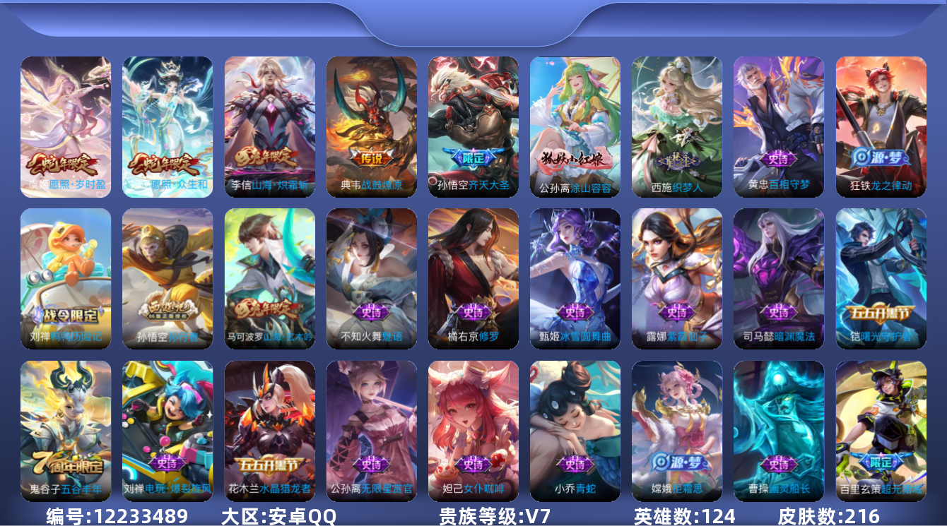 [12233489]V7 5传说 124英雄 216皮肤 可修改实名 女号 优质装备:山海·炽霜斩(李信年限),涂山容容 传说皮:典韦战鼓燎原 珍宝阁皮:蔷薇恋人,玩趣恶龙 限定皮:愿照·岁时盈(虞姬年限),愿照·众生和(妲己年限),高山流水,齐天大圣,五谷丰年,梁祝,孙行者,山海·玄木吟(马可年限) 史诗皮:鸭鸭历险记-刘禅,瑰影绮梦,龙之律动,超元猎域,百相守梦-黄忠,织梦人,紫霞仙子,黄金分割率,特工魅影,千年之狐,江河有灵,魅语,无限星赏官,青蛇,偶像歌手,电玩·爆裂旋风,末日机甲-吕布,猫狗日记-大乔,乱世虎臣,节奏热浪,修罗,女仆咖啡,水果甜心,绅士熊喵,星夜王子,功夫厨神,暗隐猎兽者,幽灵船长,鬼剑武藏,暗渊魔法,心灵战警,天秀·启明,地狱岩魂,拒霜思,乘风破浪,逐浪之夏,水晶猎龙者,曙光守护者,金属风暴,原初追逐者,圣诞狂欢,圣诞恋歌,鹰眼统帅,魅力维加斯