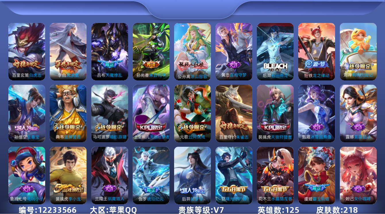 [12233566]V7 4传说 125英雄 218皮肤 可修改实名 优质装备:末日机甲-孙尚香(绿蚂蚱),涂山容容 珍宝阁皮:玩趣恶龙 限定皮:至尊宝,白虎志(电光耗子),凤求凰(白切鸡),游园惊梦,梁祝,天狼狩猎者,天狼绘梦者,李小龙,朱雀志(守约年限),如梦令-后羿,霸王别姬-虞姬,天魔缭乱 史诗皮:鸭鸭历险记-刘禅,龙之律动,琥珀纪元伽罗,星界战将,石田雨龙,百相守梦-黄忠,蔬乡物语(鲁班七号),紫霞仙子,电玩小子(小书包),黄金分割率,特工魅影,千年之狐,江河有灵,青蛇,高渐离燃音魔法,乱世虎臣,女仆咖啡,水果甜心,星夜王子,心灵骇客,功夫厨神,德古拉伯爵,暗隐猎兽者,幽灵船长,鬼剑武藏,心灵战警,乐园奇幻夜,纤云弄巧,繁星吟游(呼啦呼啦),缤纷独角兽,乘风破浪,逐浪之夏,水晶猎龙者,曙光守护者,原初追逐者,圣诞狂欢,圣诞恋歌,鹰眼统帅,王者之锤,魅力维加斯,黎明之约,未来纪元-赵云