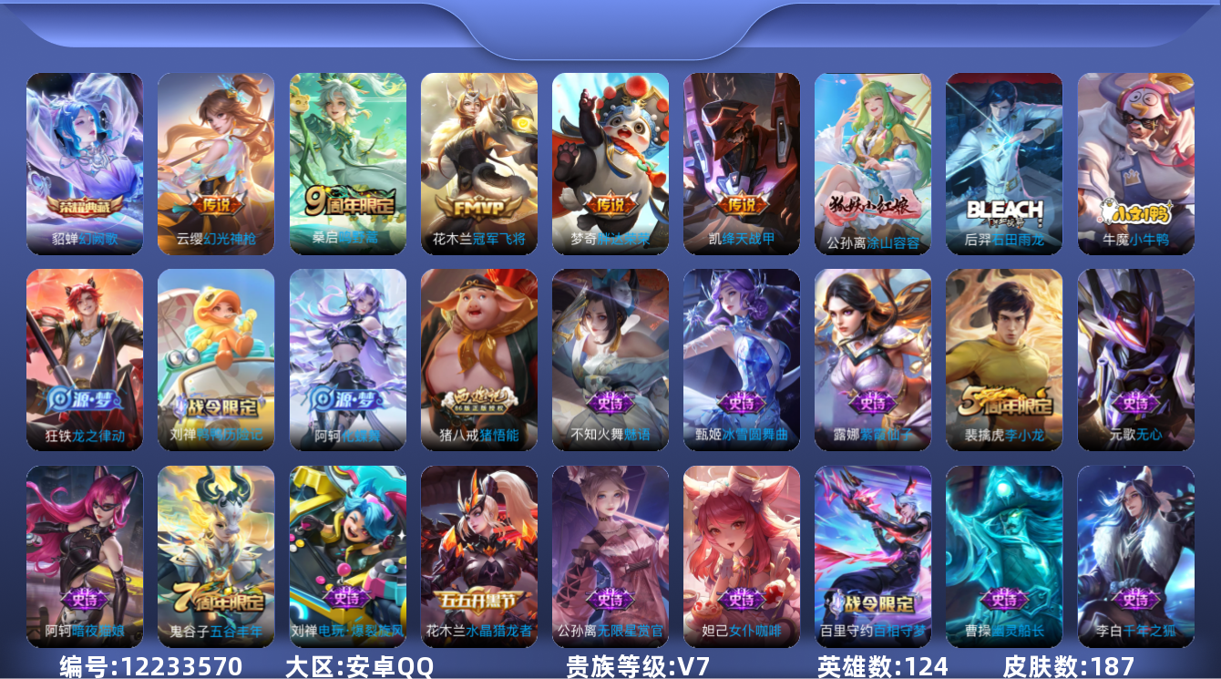 [12233570]V7 1典藏 5传说 124英雄 187皮肤 可修改实名 优质装备:幻阙歌(貂蝉典藏),冠军飞将,绛天战甲(鸡嘴战神),胖达荣荣,涂山容容 传说皮:幻光神枪 珍宝阁皮:胡桃夹子,女武神 限定皮:鸣野蒿,五谷丰年,李小龙,猪悟能 史诗皮:鸭鸭历险记-刘禅,化蝶舞,龙之律动,小牛鸭,石田雨龙,茶境仙,上官婉儿群星魔术团,蔬乡物语(鲁班七号),百相守梦-百里守约,紫霞仙子,黄金分割率,特工魅影,千年之狐,江河有灵,魅语,百解令(蒙犽),蒙恬荣光圣徽,无限星赏官,偶像歌手,电玩·爆裂旋风,暗夜猫娘,龙骑士(小龙虾),猫狗日记-孙策,节奏热浪,女仆咖啡,水果甜心,德古拉伯爵,暗隐猎兽者,幽灵船长,鬼剑武藏,乐园奇幻夜,天秀·启明,缤纷独角兽,乘风破浪,逐浪之夏,水晶猎龙者,箭羽风息,金属风暴,圣诞狂欢,圣诞恋歌,鹰眼统帅,魅力维加斯,无心,未来纪元-赵云