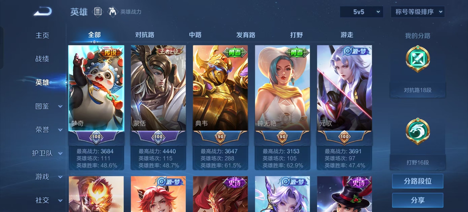 - PX_2082773-贵族等级: V9 英雄数: 124 皮肤数: 331 荣耀水晶: 鸣剑·曳影,星域神启 传说皮: 黄金狮子座,黄金射手座,冠军飞将,云鹰飞将,黄金白羊座,猫影幻舞,久胜战神,炽阳神光,一念神魔,云霓雀翎,仲夏夜之梦,零号·赤焰,地狱之眼,飞鸢探春,音你心动-周瑜,胖达荣荣,李逍遥,游龙清影,淬星耀世,超时空战士-狄仁杰,末日机甲-孙策,挚爱之约,挚爱花嫁,无双飞将,碎云,神器