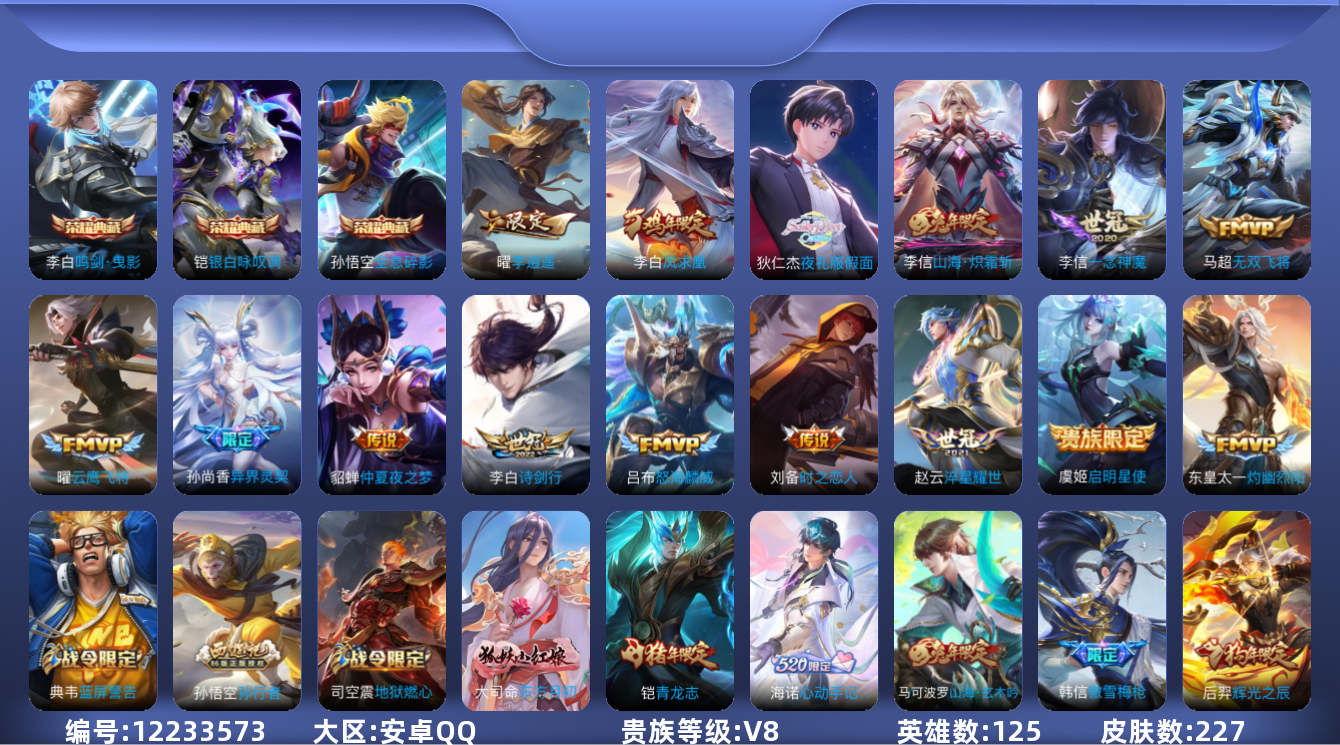 [12233573]V8 3典藏 15传说 125英雄 227皮肤 可修改实名 优质装备:鸣剑·曳影,全息碎影(猴子典藏),银白咏叹调(倪克斯侍卫),云鹰飞将(小将军),一念神魔,仲夏夜之梦(大飞蛾),李逍遥,时之恋人-刘备(电焊工),淬星耀世,无双飞将,山海·炽霜斩(李信年限),灼幽烈阳,夜礼服假面 珍宝阁皮:胡桃夹子,蔷薇恋人 限定皮:凤求凰(白切鸡),异界灵契(白毛香),傲雪梅枪,高山流水,诗剑行,怒海麟威,五谷丰年,青龙志(铠年限),游园惊梦,李小龙,逐梦之影,辉光之辰,孙行者,青春决赛季,匿光追影者,山海·玄木吟(马可年限) 史诗皮:星界战将,东方月初,海诺心动手记,紫霞仙子,电玩小子(小书包),白龙吟,黄金分割率,特工魅影,千年之狐,江河有灵,蒙恬荣光圣徽,冰冠公主,青蛇,偶像歌手,暗夜猫娘,龙骑士(小龙虾),猫狗日记-孙策,乱世虎臣,节奏热浪,修罗,女仆咖啡,水果甜心,绅士熊喵,星夜王子,心灵骇客,时之奇旅-安琪拉,暗隐猎兽者,鬼剑武藏,心灵战警,舞动绿茵,拒霜思,缤纷独角兽,乘风破浪,逐浪之夏,水晶猎龙者,曙光守护者,金属风暴,原初追逐者,鹰眼统帅,黎明之约,赏金猎手,无心,未来纪元-赵云