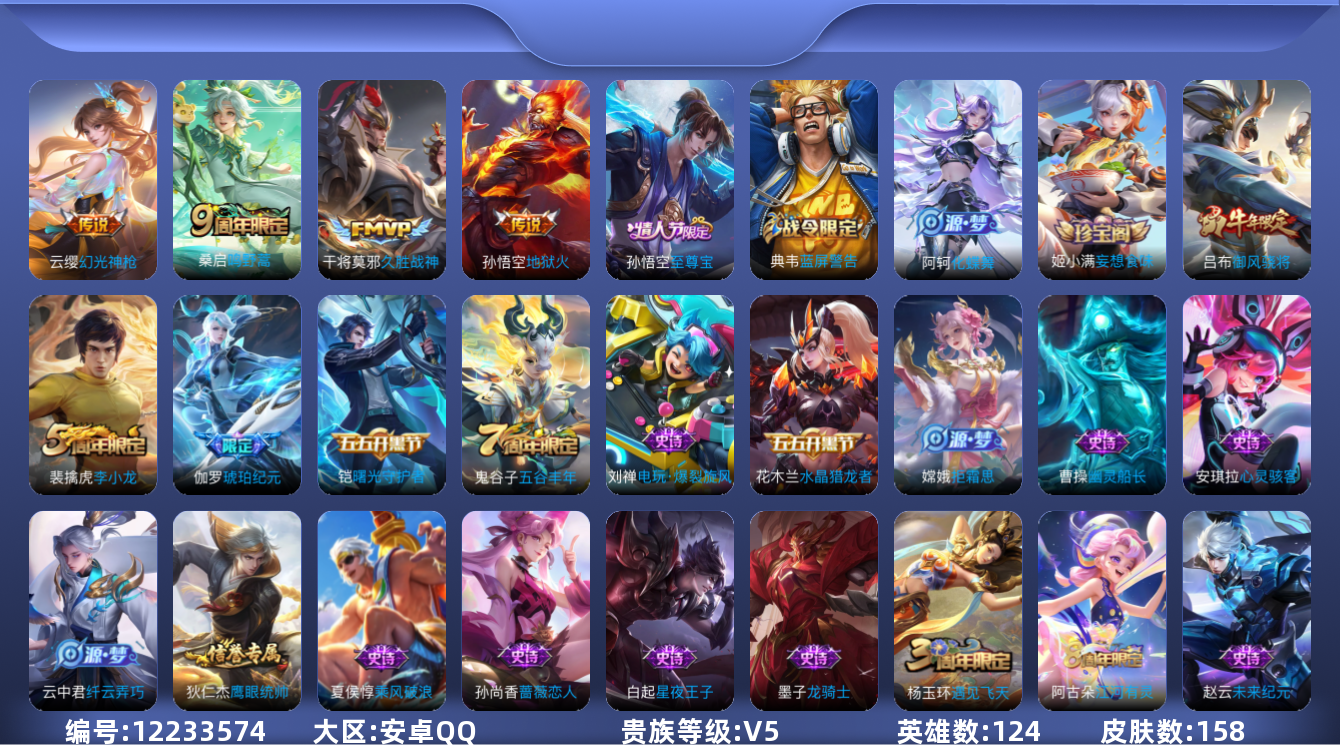 - [12023094]V7 13传说 123英雄 208皮肤 可修改实名 优质装备:零号·赤焰,淬星耀世,超时空战士-狄仁杰,无双飞将,遇见神鼓,澜逐花归海,琥珀纪元马超 传说皮:乘龙·问璇玑(孙尚香年限),貂蝉曦玄引,吕布曦玄引,落雪白狼 珍宝阁皮:妄想食味,女武神 限定皮:愿照·九州拓(澜年限),逐霄战戟,鸣野蒿,神威(电光马子),五谷丰年,游园惊梦,御风骁将(吕布年限),李小龙,猪悟能 史诗皮:化蝶舞,谪仙醉月,龙之律动,茶境仙,海诺心动手记,紫霞仙子,白龙吟,黄金分割率,江河有灵,百解令(蒙犽),冰冠公主,偶像歌手,龙骑士(小龙虾),末日机甲-吕布,乱世虎臣,修罗,水果甜心,暗隐猎兽者,鬼剑武藏,舞动绿茵,纤云弄巧,繁星吟游(呼啦呼啦),拒霜思,缤纷独角兽,乘风破浪,逐浪之夏,水晶猎龙者,曙光守护者,金属风暴,圣诞狂欢,圣诞恋歌,鹰眼统帅,无心,未来纪元-赵云