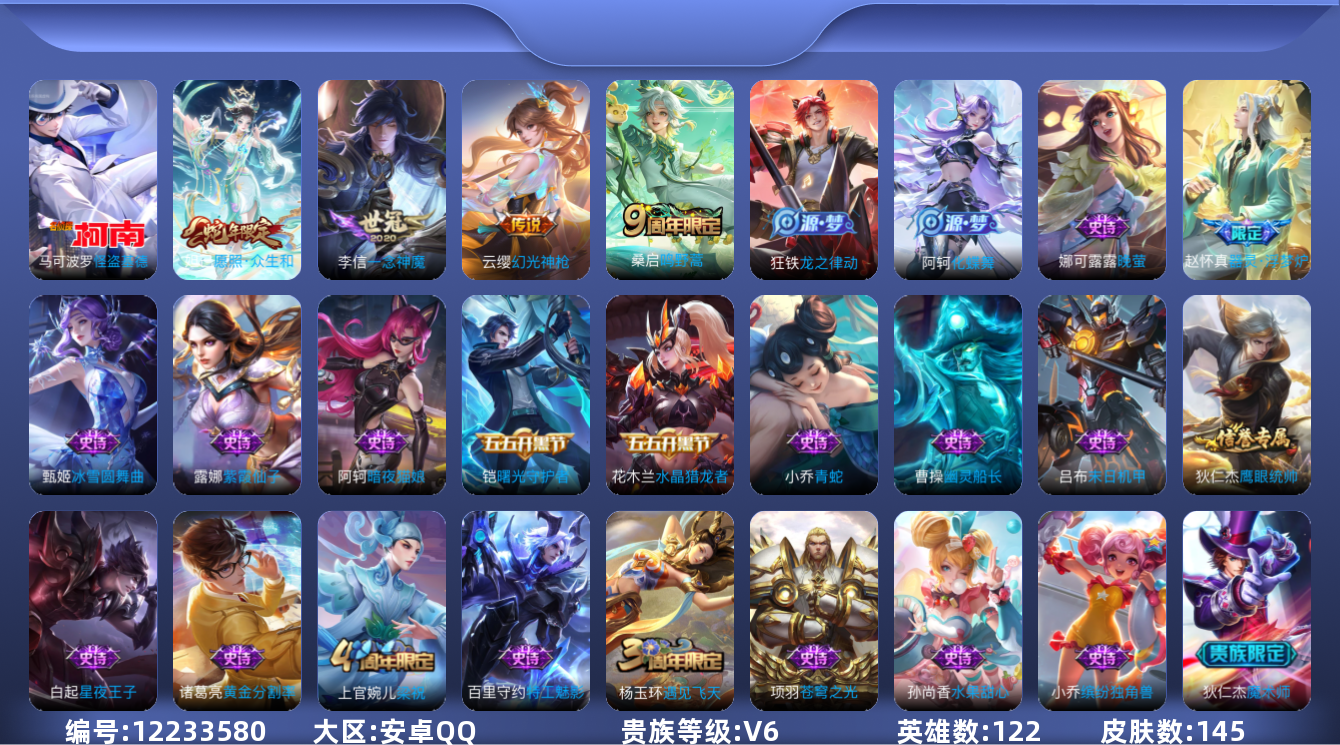- [12232578]V8 1典藏 2珍品传说 23传说 125英雄 252皮肤 可修改实名 优质装备:银白咏叹调(倪克斯侍卫),器灵·落星盏,朽木白哉,黄金射手座,冠军飞将,炽阳神光,末日机甲-孙尚香(绿蚂蚱),地狱火,地狱之眼,时之恋人-刘备(电焊工),超时空战士-狄仁杰,无双飞将,山海·炽霜斩(李信年限),山海·苍雷引(电光曜子),鹤归松栖(云缨),澜逐花归海,琥珀纪元铠,涂山容容 传说皮:乘龙·铭钟鼎(赵云年限),铠冥王哈迪斯,幻光神枪 珍宝阁皮:万物之道,玩趣恶龙 限定皮:鸣野蒿,傲雪梅枪,时雨天司(水龙头),神威(电光马子),遇见飞天,高山流水,诗剑行,五谷丰年,天狼狩猎者,逐梦之星,天狼征服者,玄武志(苏烈年限),永曜之星,孙行者,猪悟能,寅虎·赤拳(老虎年限) 史诗皮:赞萌露比,器灵·浮梦炉,星界战将,龙之律动,石田雨龙,茶境仙,破空之剑,东方月初,埋骨钱,芈月浮光幕影,百相守梦-百里守约,百相守梦-黄忠,紫霞仙子,苍穹之光,白龙吟,黄金分割率,特工魅影,千年之狐,江河有灵,鹤归松栖(赵怀真),魅语,蒙恬荣光圣徽,晚萤,电玩·爆裂旋风,银翎春语,龙骑士(小龙虾),末日机甲-吕布,猫狗日记-孙策,乱世虎臣,节奏热浪,修罗,摇滚巨星,水果甜心,星夜王子,心灵骇客,功夫厨神,德古拉伯爵,暗隐猎兽者,幽灵船长,鬼剑武藏,暗渊魔法,缤纷独角兽,乘风破浪,逐浪之夏,水晶猎龙者,曙光守护者,热力回旋,金属风暴,原初追逐者,圣诞狂欢,圣诞恋歌,鹰眼统帅,魅力维加斯,黎明之约,赏金猎手,顽趣-阿古朵,无心,未来纪元-赵云