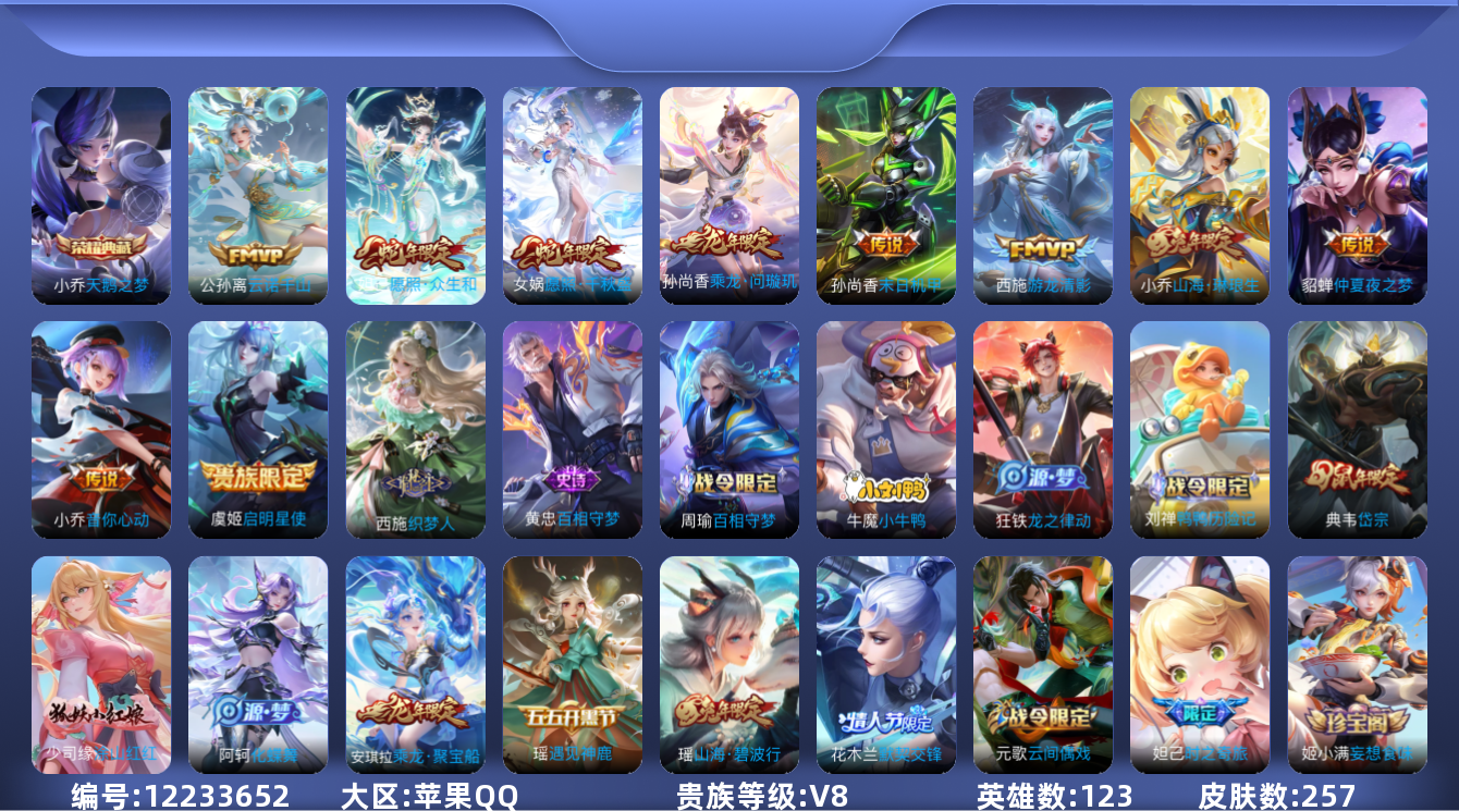 [12233652]V8 1典藏 10传说 123英雄 257皮肤 可修改实名 女号 优质装备:天鹅之梦(小乔典藏),末日机甲-孙尚香(绿蚂蚱),仲夏夜之梦(大飞蛾),音你心动-小乔,游龙清影(小青龙),山海·琳琅生(小乔年限) 传说皮:乘龙·问璇玑(孙尚香年限),云诺千山 珍宝阁皮:妄想食味,蔷薇恋人 限定皮:愿照·众生和(妲己年限),愿照·千秋盛(女娲年限),时之彼端,魔法小厨娘,山海·碧波行(瑶年限),五谷丰年,岱宗(典韦年限),李小龙,默契交锋-花木兰,一生所爱,寅虎·心曲(虎婆),时之奇旅-妲己,神器·万象笔 史诗皮:鸭鸭历险记-刘禅,化蝶舞,龙之律动,小牛鸭,百相守梦-周瑜,涂山红红,乘龙·聚宝船(安琪拉年限),百相守梦-黄忠,织梦人,遇见神鹿,紫霞仙子,高渐离燃音魔法,冰冠公主,青蛇,偶像歌手,白蛇,晚萤,电玩·爆裂旋风,女仆咖啡,水果甜心,心灵骇客,德古拉伯爵,幽灵船长,鬼剑武藏,地狱岩魂,诗语江南,繁星吟游(呼啦呼啦),缤纷独角兽,乘风破浪,水晶猎龙者,唤灵魅影,金属风暴,圣诞恋歌,鹰眼统帅,魅力维加斯,无心,未来纪元-赵云