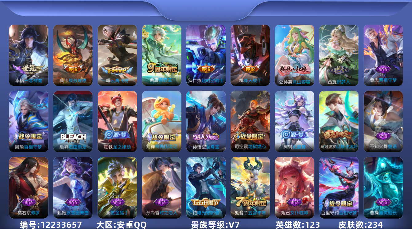 [12233657]V7 6传说 123英雄 234皮肤 可修改实名 优质装备:云鹰飞将(小将军),绛天战甲(鸡嘴战神),一念神魔,超时空战士-狄仁杰,涂山容容 传说皮:典韦战鼓燎原 珍宝阁皮:胡桃夹子,玩趣恶龙 限定皮:鸣野蒿,至尊宝,五谷丰年,山海·玄木吟(马可年限) 史诗皮:鸭鸭历险记-刘禅,化蝶舞,星界战将,龙之律动,石田雨龙,百相守梦-周瑜,茶境仙,蒙犽顽岩魄,蔬乡物语(鲁班七号),百相守梦-百里守约,百相守梦-黄忠,织梦人,苍穹之光,黄金分割率,特工魅影,江河有灵,魅语,百解令(蒙犽),偶像歌手,末日机甲-吕布,猫狗日记-孙策,时之恋人-孙尚香,节奏热浪,修罗,女仆咖啡,摇滚巨星,水果甜心,绅士熊喵,星夜王子,心灵骇客,功夫厨神,暗隐猎兽者,幽灵船长,鬼剑武藏,心灵战警,乐园奇幻夜,天秀·启明,缤纷独角兽,乘风破浪,逐浪之夏,曙光守护者,箭羽风息,唤灵魅影,金属风暴,圣诞狂欢,魅力维加斯,赏金猎手,未来纪元-赵云
