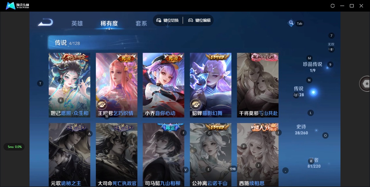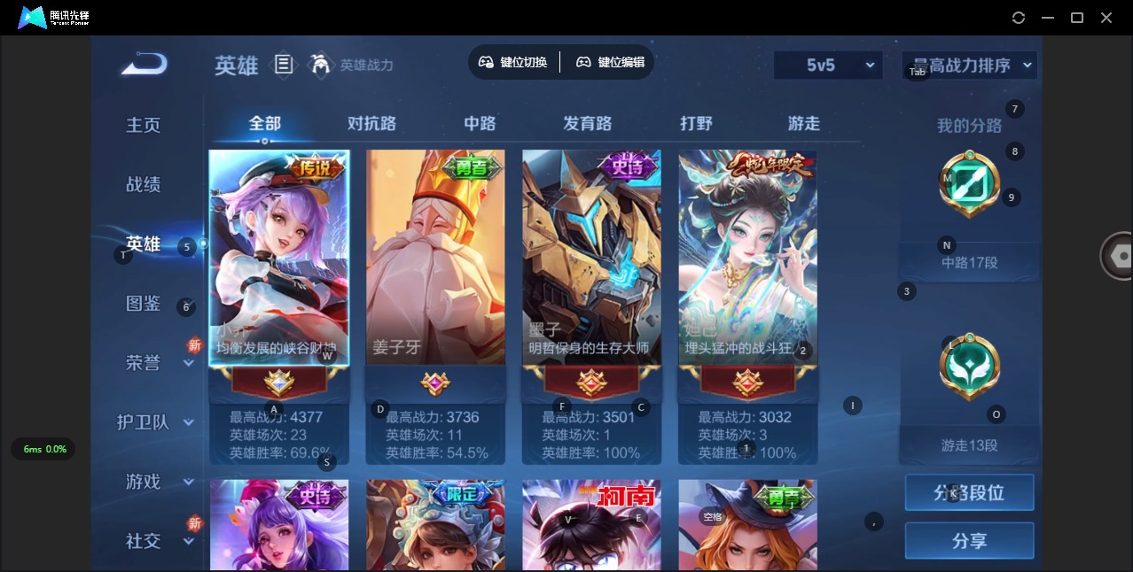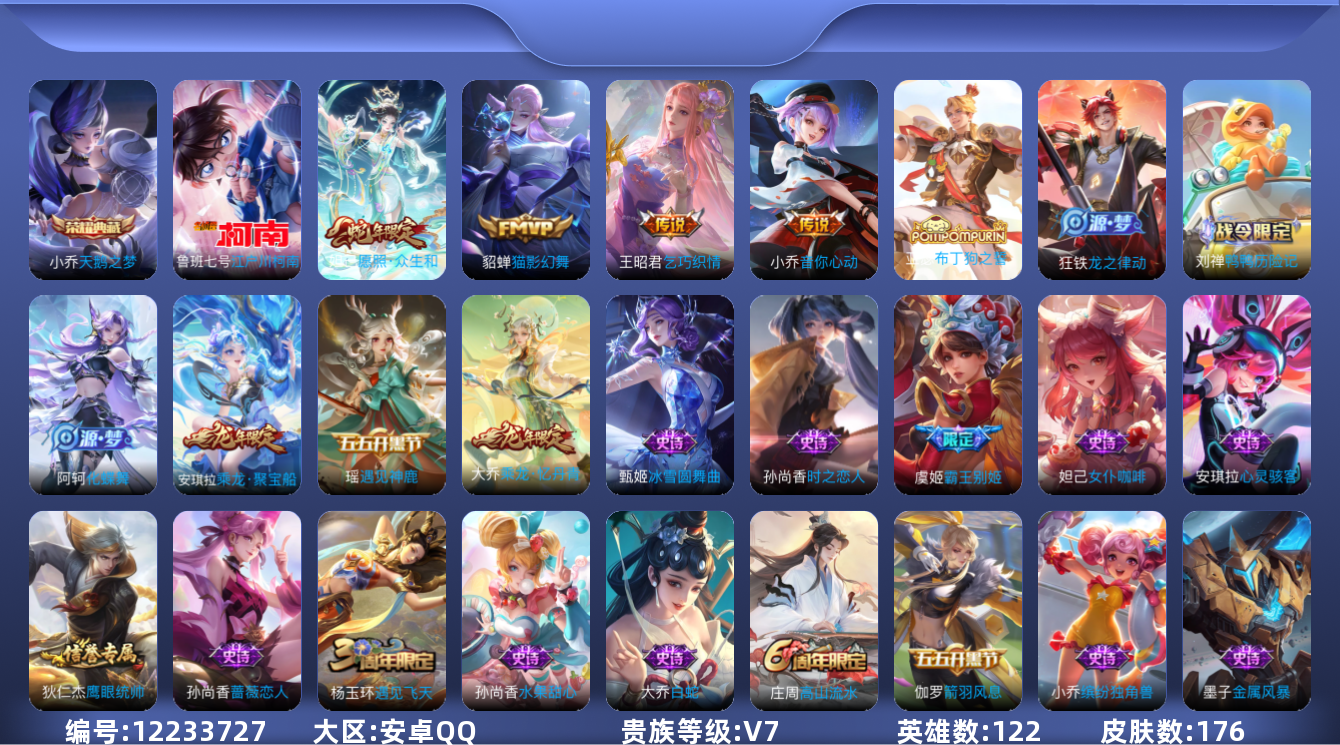 - [11529686]V6 2典藏 7传说 124英雄 267皮肤 可修改实名 优质装备:鸣剑·曳影,星域神启(倪克斯贼亮),云鹰飞将(小将军),久胜战神,地狱之眼 传说皮:幻光神枪 珍宝阁皮:蔷薇恋人,女武神 限定皮:愿照·九州拓(澜年限),愿照·山河定(司空震年限),鸣野蒿,遇见飞天,高山流水,五谷丰年,游园惊梦,梁祝,李小龙 史诗皮:器灵·浮梦炉,化蝶舞,灵蛊蚀心,星界战将,龙之律动,石田雨龙,茶境仙,破空之剑,蒙犽顽岩魄,琥珀纪元伽罗,百相守梦-黄忠,白龙吟,黄金分割率,特工魅影,千年之狐,江河有灵,百解令(蒙犽),高渐离燃音魔法,蒙恬荣光圣徽,青蛇,偶像歌手,晚萤,电玩·爆裂旋风,暗夜猫娘,末日机甲-吕布,猫狗日记-孙策,猫狗日记-大乔,乱世虎臣,节奏热浪,修罗,女仆咖啡,水果甜心,绅士熊喵,天才门将,星夜王子,心灵骇客,功夫厨神,德古拉伯爵,暗隐猎兽者,幽灵船长,鬼剑武藏,心灵战警,舞动绿茵,地狱岩魂,繁星吟游(呼啦呼啦),缤纷独角兽,乘风破浪,逐浪之夏,月团寄思,水晶猎龙者,曙光守护者,箭羽风息,金属风暴,原初追逐者,圣诞狂欢,圣诞恋歌,鹰眼统帅,暗夜贵公子,魅力维加斯,黎明之约,无心,未来纪元-赵云
