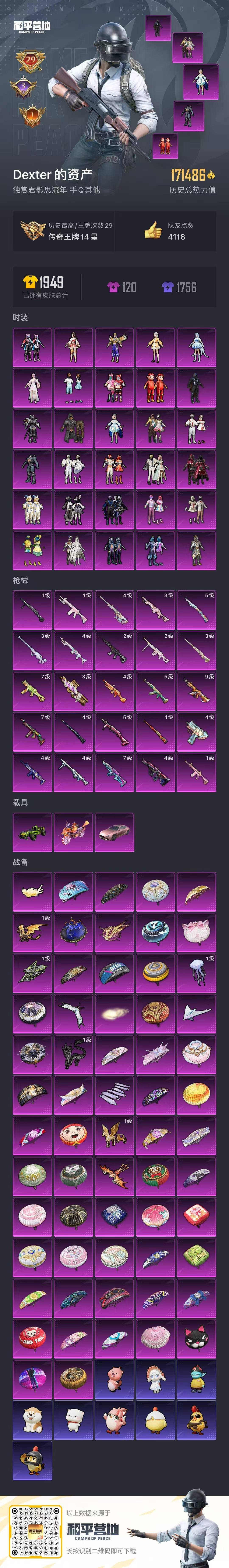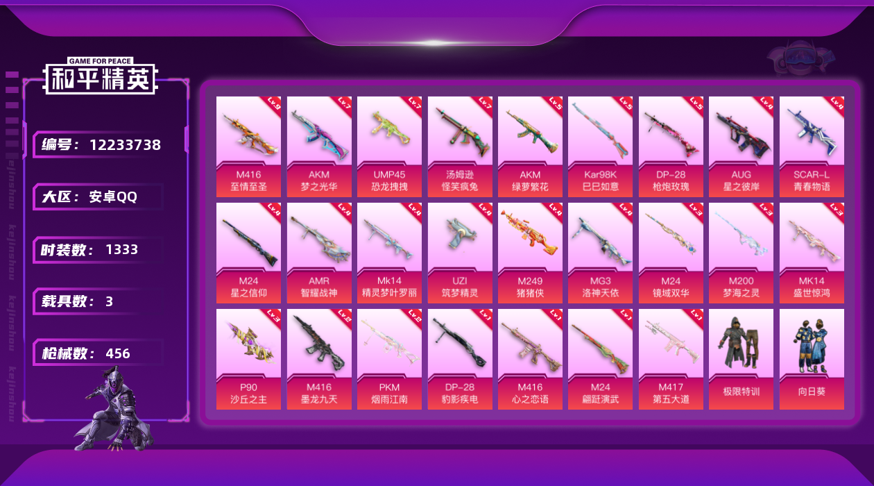 [12233738]30粉装 25特效枪 3载具 29印记 可二次 可修改实名 身法装备:暗影哥特(红眼罩),8号机(新粉螳螂),Mark.06(新蓝螳螂),巡查衣(绝对防御上衣) 优质装备:玛莎拉蒂Ghibli(粉),合金龙骨(绿),巡查员衣服(绝对防御上衣),九级M416-至情至圣(满级至情至圣M416),巡查衣(绝对防御上衣),MG3洛神天依,M24星之信仰,M416心之恋语,奇异狩猎者,蝶舞迷情,极限特训,深海曼妙,宝贝奶油派,天使彩虹糖,银河战甲,金曜白虎,向日葵(套装-向日葵先生),香水柠檬,PEL轰鸣竞梦者,炙焰红王,冰霜白皇,俏皮狐尾,AUG星之彼岸,汤姆逊怪笑疯兔,AKM梦之光华,DP-28枪炮玫瑰,洛天依,SCAR-L青春物语,UMP45恐龙拽拽,UZI筑梦精灵,M24翩跹演武,M416至情至圣,M417第五大道,AKM绿萝繁花,P90沙丘之主,M249猪猪侠,M24镜域双华,PKM江南烟雨,七级UMP45-恐龙拽拽,七级AKM-梦之光华,七级汤姆逊-怪笑疯兔,Mk14精灵梦叶罗丽,M416墨龙九天,M200梦海之灵,狂花道·不知火舞,MK14-盛世惊鸿,幻影飞狐,AMR-智耀战神,Kar98K-巳巳如意 热门装扮:飓风飞鹰,黑伞漫漫,酣梦娃娃,筑梦精灵,霞光圣骑,寒光使者,复仇流浪者,冰川红玫,仲夏莫吉托,呆萌星弥,暗夜玫瑰,猪猪侠,烟云彩露,美琪,光极星,奶芙汪汪,恶魔喵喵,迅捷狂鲨,万圣娃娃,梦魇先生,深海小丑鱼,东方飞龙,浪漫波比,好奇恐龙,暗夜魅影 载具:鬼马风驰 稀有枪皮:DP-28-豹影疾电 五级特效枪:五级Kar98K-巳巳如意,五级AKM-绿萝繁花,五级DP-28-枪炮玫瑰 四级特效枪:四级M24-星之信仰,四级Mk14-精灵梦叶罗丽,四级AMR-智耀战神,四级AUG-星之彼岸,四级M249-猪猪侠,四级MG3-洛神天依,四级SCAR-L-青春物语,四级UZI-筑梦精灵 三级特效枪:三级M200-梦海之灵,三级MK14-盛世惊鸿,三级P90-沙丘之主,三级M24-镜域双华 二级特效枪:二级M416-墨龙九天,二级PKM-江南烟雨 一级特效枪:一级M416-心之恋语,一级DP-28-豹影疾电,一级M417-第五大道,一级M24-翩跹演武 紫色装扮:幻彩翩翩,SS23特训,妙红点点,极速光影,SS30特训套装,SS31特训套装,SS33特训套装,青