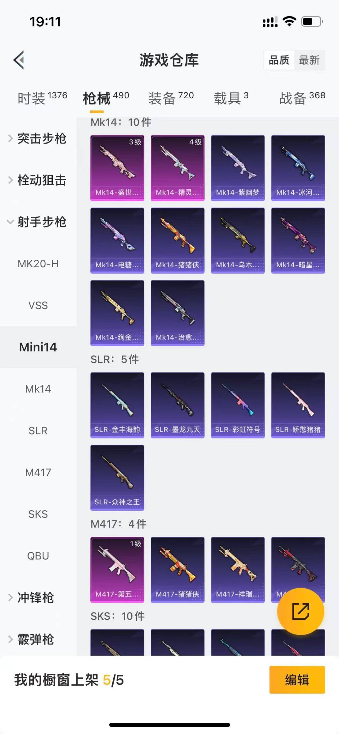 AKM-奇异狩猎者,M762-瑞龙福将,M416-快乐主宰,Kar98K-深海曼妙,Kar98K-古堡领主,Mini14-林间仙鹿,S686-奇异狩猎者,M249-金丰海韵