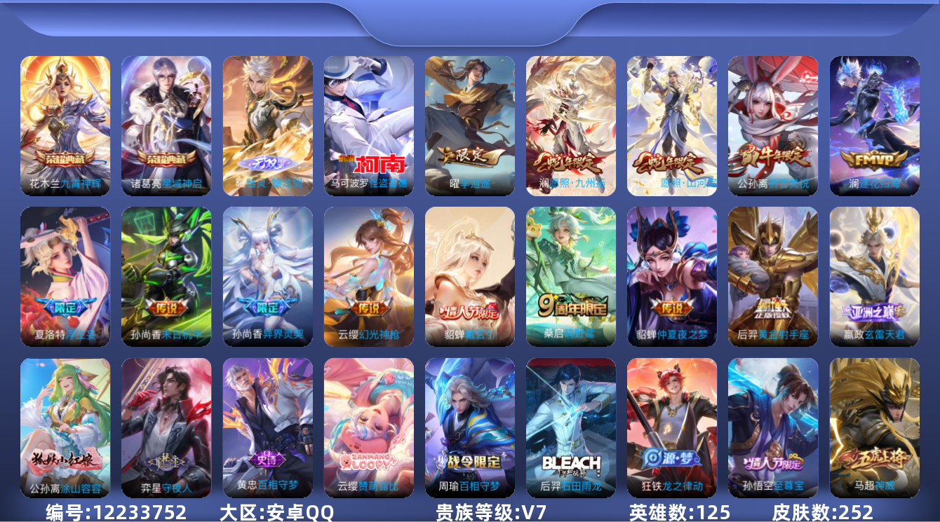 [12233752]V7 2典藏 1无双 1珍品传说 14传说 125英雄 252皮肤 可修改实名 优质装备:星域神启(倪克斯贼亮),九霄神辉(木兰典藏),器灵·螭龙剑,怪盗基德,黄金射手座,末日机甲-孙尚香(绿蚂蚱),仲夏夜之梦(大飞蛾),李逍遥,浮生妄,澜逐花归海,玄雷天君,涂山容容 传说皮:貂蝉曦玄引,幻光神枪 珍宝阁皮:胡桃夹子,女武神,玩趣恶龙 限定皮:愿照·九州拓(澜年限),愿照·山河定(司空震年限),逐霄战戟,鸣野蒿,至尊宝,异界灵契(白毛香),神威(电光马子),高山流水,五谷丰年,冰锋战神,梁祝,逐梦之星,天狼溯光者,祈雪灵祝(雪兔子),李小龙,朱雀志(守约年限),默契交锋-花木兰,孙行者,山海·玄木吟(马可年限) 史诗皮:赞萌露比,化蝶舞,星界战将,谪仙醉月,龙之律动,石田雨龙,百相守梦-周瑜,茶境仙,怒海争锋,百相守梦-百里守约,百相守梦-黄忠,守夜人,紫霞仙子,电玩小子(小书包),黄金分割率,特工魅影,千年之狐,永昼,江河有灵,高渐离燃音魔法,蒙恬荣光圣徽,偶像歌手,电玩·爆裂旋风,龙骑士(小龙虾),末日机甲-吕布,猫狗日记-孙策,猫狗日记-大乔,乱世虎臣,节奏热浪,修罗,女仆咖啡,天才门将,星夜王子,心灵骇客,功夫厨神,德古拉伯爵,暗隐猎兽者,幽灵船长,鬼剑武藏,暗渊魔法,心灵战警,天秀·启明,舞动绿茵,地狱岩魂,拒霜思,缤纷独角兽,乘风破浪,逐浪之夏,月团寄思,水晶猎龙者,曙光守护者,金属风暴,原初追逐者,圣诞狂欢,圣诞恋歌,鹰眼统帅,暗夜贵公子,黎明之约,赏金猎手,未来纪元-赵云