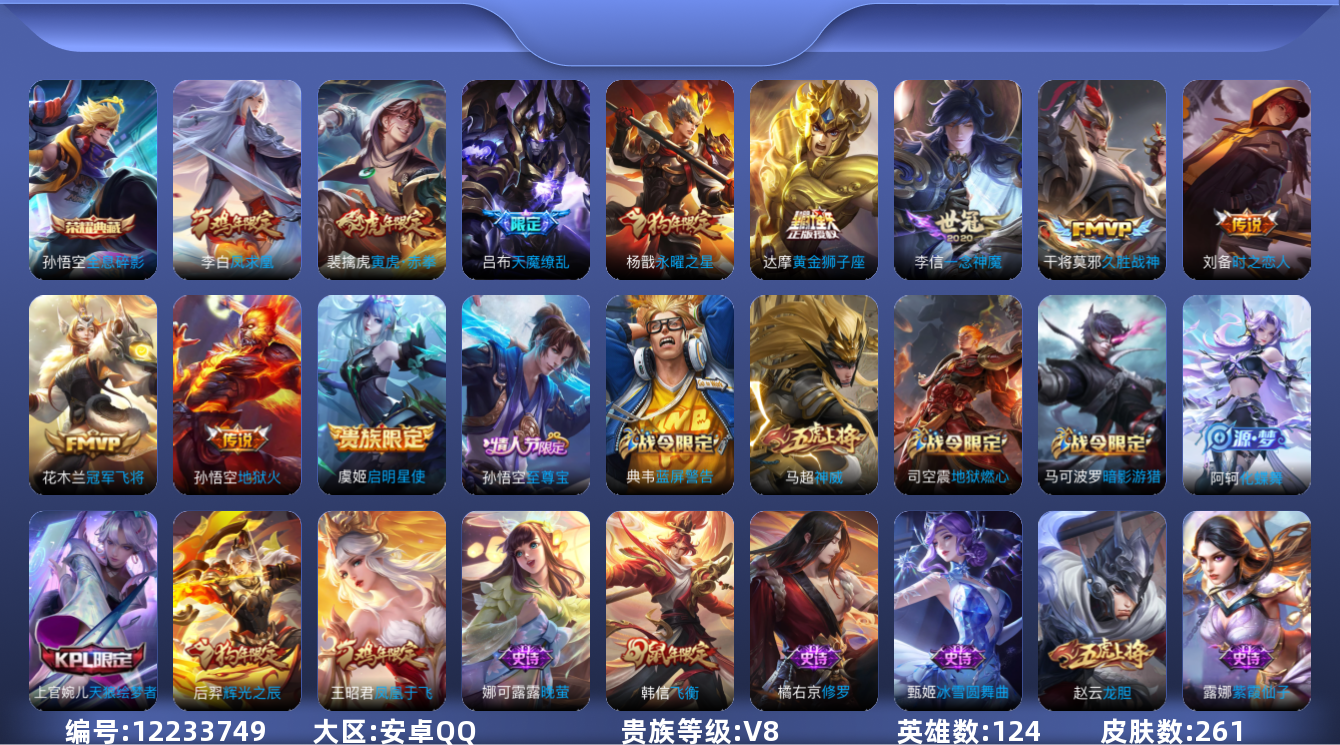 [12233749]V8 1典藏 11传说 124英雄 261皮肤 可修改实名 优质装备:全息碎影(猴子典藏),黄金狮子座,冠军飞将,久胜战神,一念神魔,地狱火,时之恋人-刘备(电焊工) 珍宝阁皮:玩趣恶龙 限定皮:逐霄战戟,至尊宝,凤求凰(白切鸡),凤凰于飞,神威(电光马子),飞衡(韩信年限),瑞麟志(木兰年限),遇见飞天,高山流水,梁祝,龙胆,天狼绘梦者,李小龙,永曜之星,辉光之辰,天魔缭乱,寅虎·赤拳(老虎年限) 史诗皮:化蝶舞,紫霞仙子,苍穹之光,电玩小子(小书包),白龙吟,黄金分割率,特工魅影,千年之狐,江河有灵,百解令(蒙犽),蒙恬荣光圣徽,无限星赏官,冰冠公主,晚萤,猫狗日记-孙策,乱世虎臣,修罗,女仆咖啡,摇滚巨星,水果甜心,天才门将,星夜王子,心灵骇客,功夫厨神,德古拉伯爵,暗隐猎兽者,幽灵船长,鬼剑武藏,地狱岩魂,纤云弄巧,繁星吟游(呼啦呼啦),缤纷独角兽,乘风破浪,逐浪之夏,水晶猎龙者,金属风暴,原初追逐者,圣诞狂欢,圣诞恋歌,鹰眼统帅,王者之锤,魅力维加斯,黎明之约