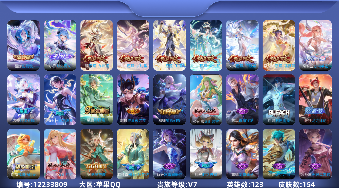 [12233809]V7 1典藏 1无双 12传说 123英雄 154皮肤 可修改实名 优质装备:幻阙歌(貂蝉典藏),小乔时之魔女(小乔无双),猫影幻舞,仲夏夜之梦(大飞蛾),大乔-时之奇旅,朵莉亚心动手记,涂山容容 传说皮:星之鸣奏 珍宝阁皮:蔷薇恋人 限定皮:愿照·九州拓(澜年限),愿照·福禄聚(蔡文姬年限),愿照·岁时盈(虞姬年限),愿照·山河定(司空震年限),愿照·众生和(妲己年限),愿照·千秋盛(女娲年限),陌上桑,鸣野蒿,时之彼端,魔法小厨娘,逐梦之音 史诗皮:鸭鸭历险记-刘禅,器灵·浮梦炉,星界战将,龙之律动,石田雨龙,茶境仙,破空之剑,战舞者,涂山红红,蒙犽顽岩魄,蔬乡物语(鲁班七号),百相守梦-黄忠,遇见神鹿,紫霞仙子,高渐离燃音魔法,无限星赏官,冰冠公主,青蛇,猫狗日记-大乔,乱世虎臣,女仆咖啡,摇滚巨星,水果甜心,星夜王子,心灵骇客,暗隐猎兽者,鬼剑武藏,舞动绿茵,缤纷独角兽,逐浪之夏,唤灵魅影,圣诞恋歌,鹰眼统帅,暗夜贵公子