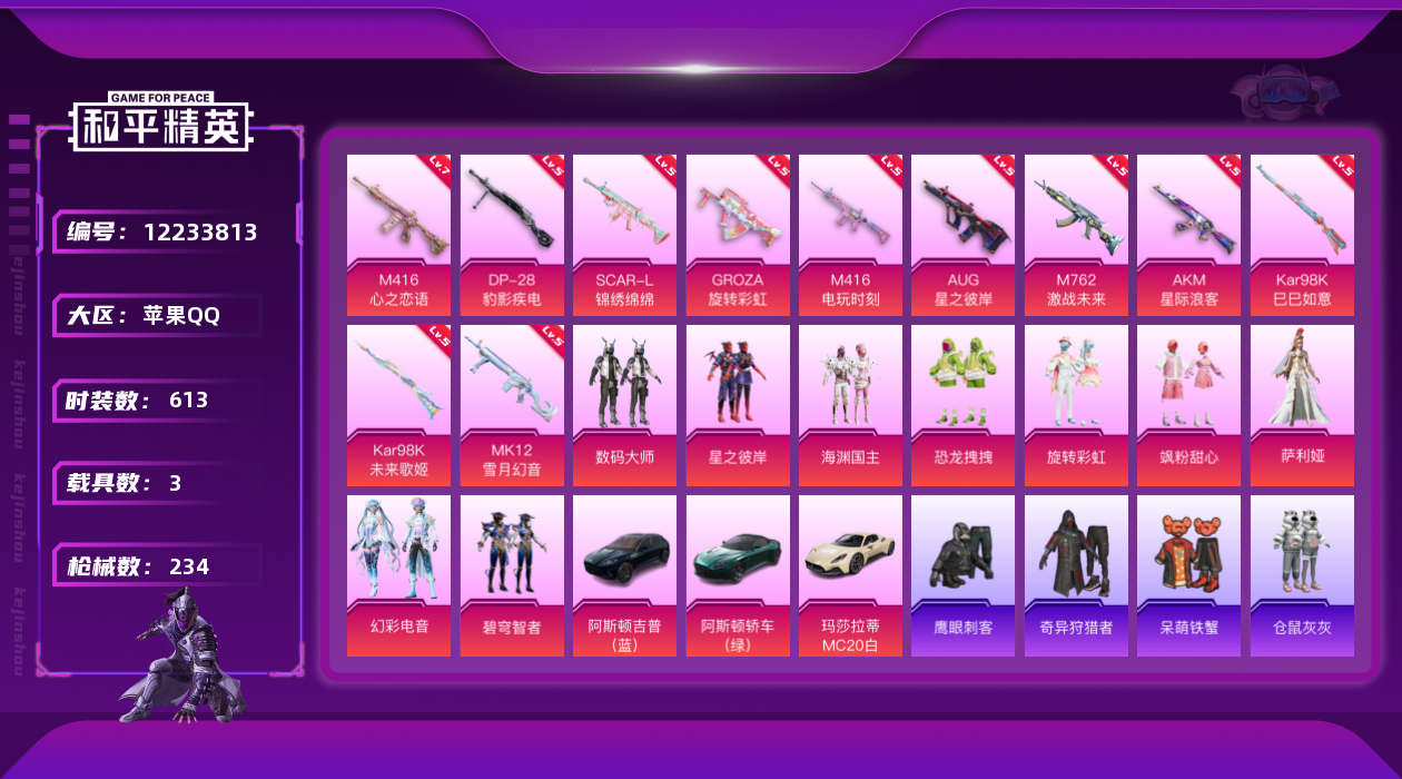 [12233813]9粉装 11特效枪 3载具 11印记 可二次 可修改实名 优质装备:阿斯顿·马丁DBS(绿),阿斯顿·马丁DBX(蓝),玛莎拉蒂MC20(星石白),M416心之恋语,奇异狩猎者,数码大师,M762激战未来,星之彼岸,AUG星之彼岸,GROZA旋转彩虹,AKM星际浪客,Kar98K未来歌姬,SCAR-L-锦绣绵绵,七级M416-心之恋语,M416电玩时刻,萨利娅,MK12-雪月幻音,幻彩电音,Kar98K-巳巳如意 热门装扮:海渊国主,恐龙拽拽,旋转彩虹,碧穹智者,飒粉甜心,软萌银虎,蔷薇魔法师,仓鼠灰灰,鹰眼刺客,呆萌铁蟹 稀有枪皮:DP-28-豹影疾电 五级特效枪:五级M762-激战未来,五级Kar98K-巳巳如意,五级DP-28-豹影疾电,五级MK12-雪月幻音,五级AUG-星之彼岸,五级Kar98K-未来歌姬,五级M416-电玩时刻,五级SCAR-L-锦绣绵绵,五级AKM-星际浪客,五级GROZA-旋转彩虹 紫色装扮:SS23特训,SS31特训套装,云朵鹅,雪绒豹,SS33特训套装,旭日情侣,SS21特训,田园牧歌,轻风白浪,和煦暖阳,SS22特训,顶瓜瓜,圣诞大吉,凛冬战士,北国孤狼,千禧之恋,吉莉礼服,夏日音浪,幻世战舞者,萌趣咩咩,乐音,,SS5特训,六六大吉,军械专家,冰原使者,娇憨猪猪,暴风机械师,SS16特训,天籁歌者,瑞龙福将,团圆交子,SS17特训,治愈之星,迅捷之星,科技之星,SS14特训,萌趣颜团子,特种颜团子,星梦畅游,快乐星愿,青春冒险家,潮流游乐家,SS15特训,暗夜傀儡,SS20特训,梦幻奶油,酸甜橘柚,怒火燎原,SS18特训,豚鼠丹丹,雪兔飞飞,SS19特训,风暴特警,飞行日记,骑行爱好者,鹤鸣,麻辣教官,黎明保卫者,黑色伏地魔,龟仙人,霓虹街区,酷潮明星,跃动心情,酷萌兔限定,金鼠迎春,长空猛禽,雪山征服者,雪山精英,涂山之恋,灰色格斗者,牛气冲天,牛气满满,海岛探路者,探宝勇士,极地朋克,柠萌假日,格斗先锋,缤纷果语,荧惑魅影,蓝彩潮人,竞技勇士朋克,空投萌叽,特战装甲,特殊使命,特训学院,王牌教练,甜蜜告白,甜蜜熊情侣,疯狂小兔子,破晓战魂,福星高照,SS29特训,SS28特训,鱼渊荷华,玉兔迎春,燕燕于飞,巳巳如意,智谋强哥,异域银装,竞技名士,光矢逐梦,神气柴柴,懵萌河马,SS24特训(SS24特训套装),绚紫流光,