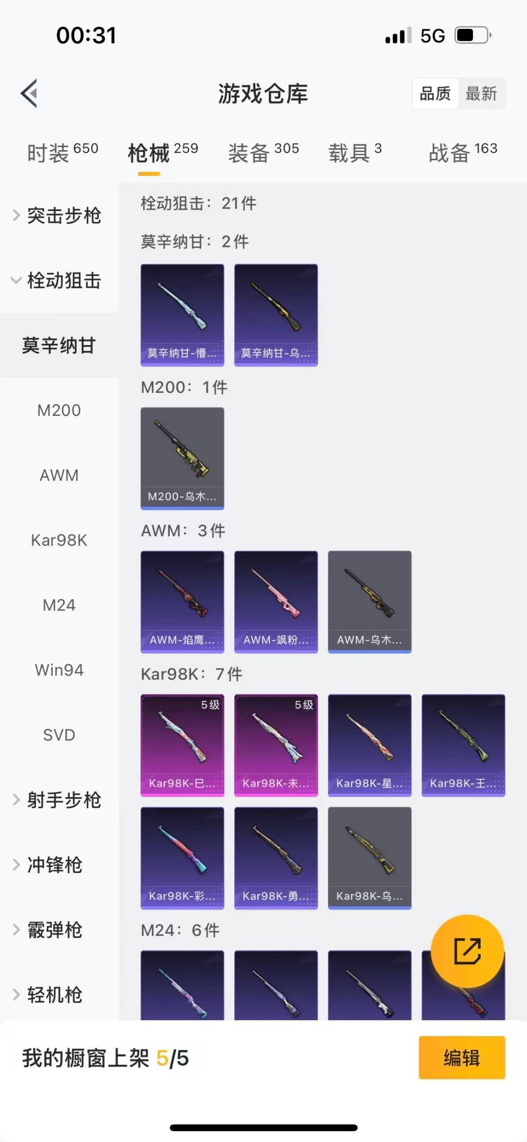 M416-仓鼠灰灰,M762-瑞龙福将,M762-奇异狩猎者,AKM-奇异狩猎者,M24-奇异狩猎者,S686-奇异狩猎者,M249-古堡领主