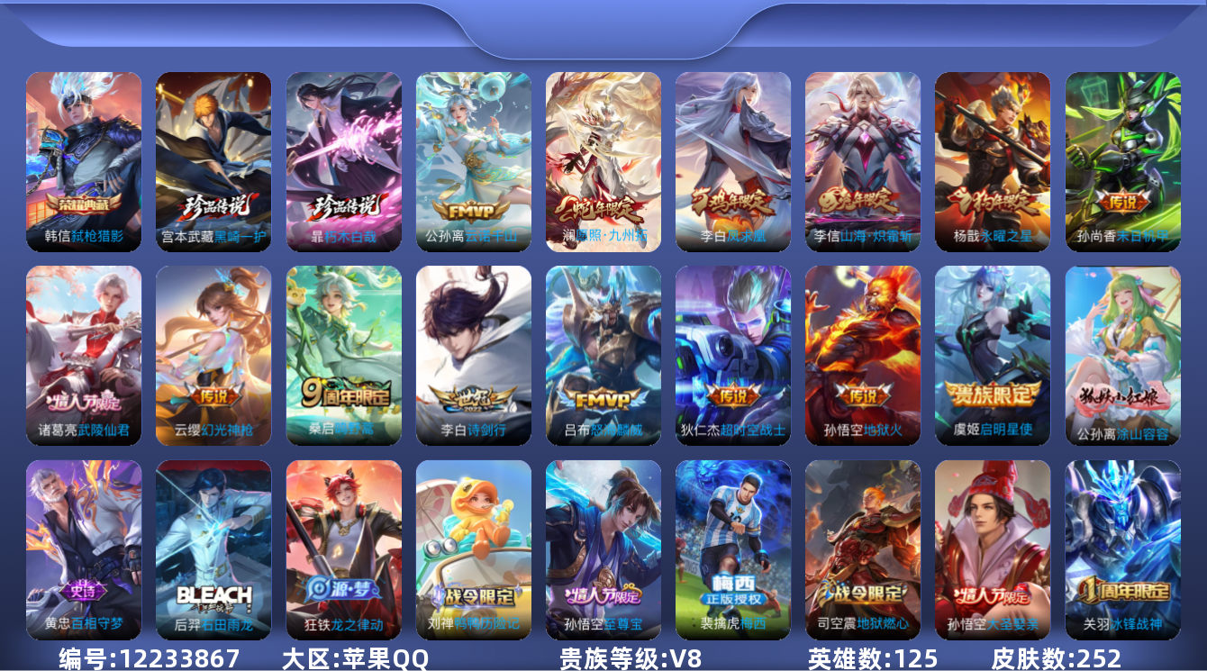 [12233867]V8 1典藏 2珍品传说 14传说 125英雄 252皮肤 可修改实名 优质装备:弑枪猎影(韩信典藏),朽木白哉,黑崎一护,末日机甲-孙尚香(绿蚂蚱),地狱火,超时空战士-狄仁杰,山海·炽霜斩(李信年限),涂山容容 传说皮:云诺千山,幻光神枪 珍宝阁皮:胡桃夹子,女武神 限定皮:愿照·九州拓(澜年限),鸣野蒿,至尊宝,凤求凰(白切鸡),梅西,武陵仙君(小桃花),飞衡(韩信年限),诗剑行,怒海麟威,冰锋战神,逐梦之影,永曜之星,辉光之辰,大圣娶亲,美猴王 史诗皮:鸭鸭历险记-刘禅,星界战将,龙之律动,石田雨龙,茶境仙,怒海争锋,战舞者,蔬乡物语(鲁班七号),百相守梦-黄忠,紫霞仙子,白龙吟,黄金分割率,千年之狐,江河有灵,末日机甲-莱西奥,魅语,百解令(蒙犽),蒙恬荣光圣徽,偶像歌手,晚萤,电玩·爆裂旋风,龙骑士(小龙虾),末日机甲-吕布,猫狗日记-孙策,乱世虎臣,节奏热浪,女仆咖啡,摇滚巨星,水果甜心,绅士熊喵,天才门将,星夜王子,功夫厨神,德古拉伯爵,暗隐猎兽者,幽灵船长,鬼剑武藏,心灵战警,缤纷独角兽,乘风破浪,逐浪之夏,月团寄思,水晶猎龙者,曙光守护者,箭羽风息,金属风暴,原初追逐者,圣诞狂欢,圣诞恋歌,鹰眼统帅,暗夜贵公子,魅力维加斯,未来纪元-赵云