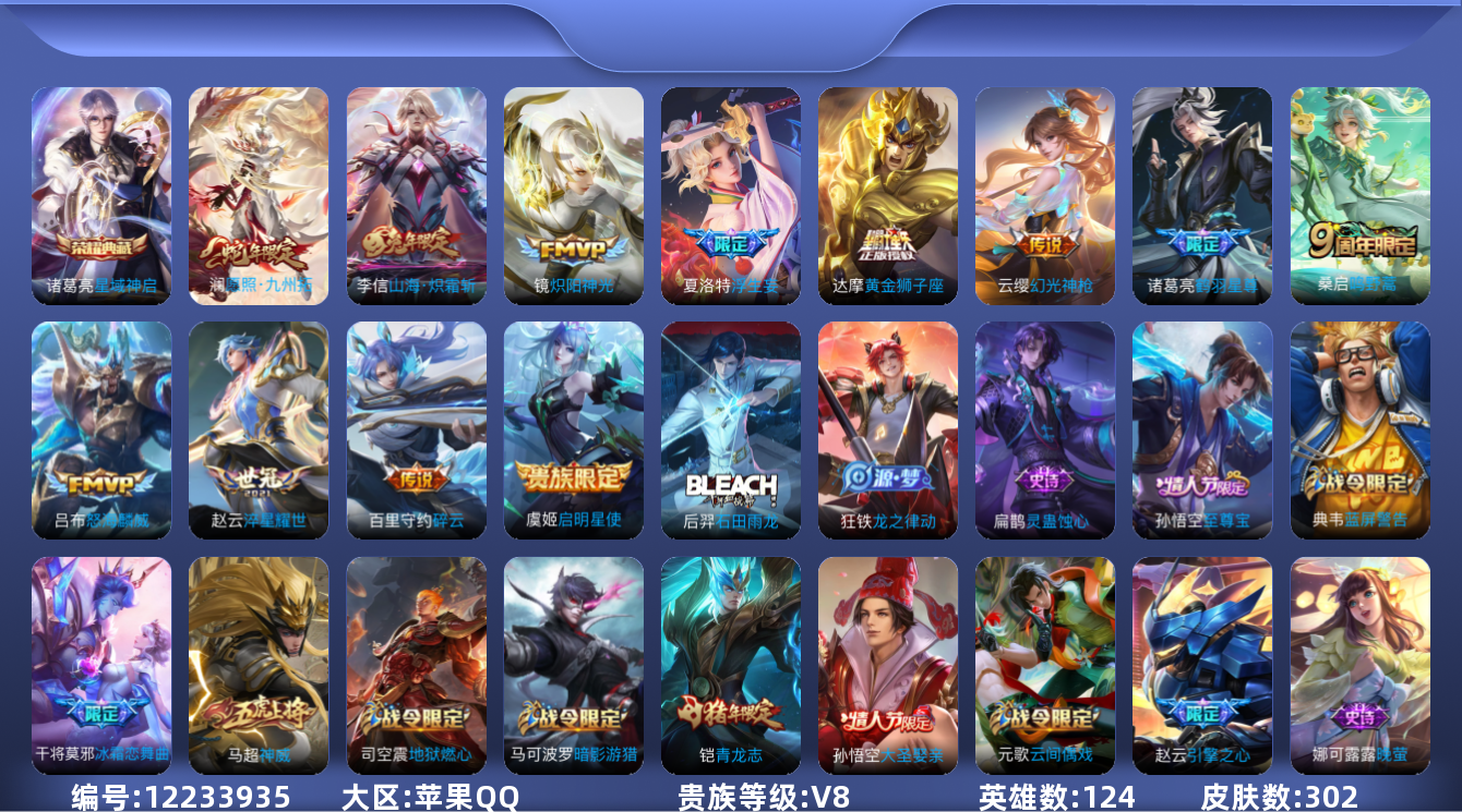 [12233935]V8 1典藏 12传说 124英雄 302皮肤 可修改实名 优质装备:星域神启(倪克斯贼亮),黄金狮子座,炽阳神光,淬星耀世,碎云,山海·炽霜斩(李信年限),浮生妄,鹤羽星尊 传说皮:幻光神枪 珍宝阁皮:万物之道,女武神,玩趣恶龙 限定皮:愿照·九州拓(澜年限),鸣野蒿,至尊宝,神威(电光马子),飞衡(韩信年限),遇见飞天,高山流水,怒海麟威,五谷丰年,青龙志(铠年限),天狼运算者,游园惊梦,梁祝,李小龙,大圣娶亲,引擎之心,冰霜恋舞曲,唐三藏,神器·万象笔 史诗皮:灵蛊蚀心,星界战将,龙之律动,石田雨龙,炽弈燎原,蒙犽顽岩魄,电玩小子(小书包),黄金分割率,特工魅影,江河有灵,蒙恬荣光圣徽,冰冠公主,偶像歌手,白蛇,晚萤,电玩·爆裂旋风,暗夜猫娘,百相守梦(关羽),龙骑士(小龙虾),猫狗日记-孙策,猫狗日记-大乔,时之恋人-孙尚香,乱世虎臣,节奏热浪,女仆咖啡,摇滚巨星,水果甜心,天才门将,星夜王子,功夫厨神,德古拉伯爵,暗隐猎兽者,幽灵船长,鬼剑武藏,心灵战警,舞动绿茵,地狱岩魂,纤云弄巧,乘风破浪,逐浪之夏,水晶猎龙者,曙光守护者,唤灵魅影,金属风暴,原初追逐者,圣诞狂欢,圣诞恋歌,鹰眼统帅,暗夜贵公子,魅力维加斯,黎明之约,滕王阁序,无心,未来纪元-赵云