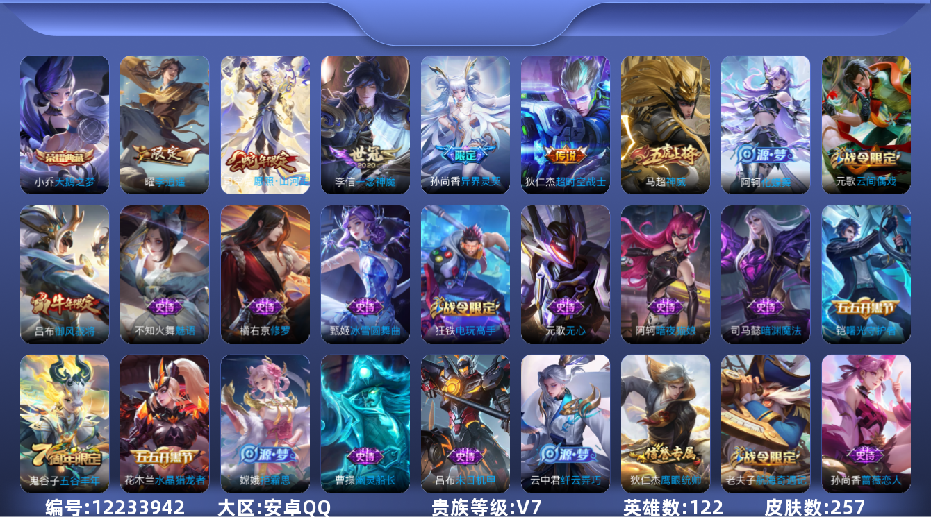 [12233942]V7 1典藏 5传说 122英雄 257皮肤 可修改实名 优质装备:天鹅之梦(小乔典藏),一念神魔,李逍遥,超时空战士-狄仁杰 珍宝阁皮:蔷薇恋人,玩趣恶龙 限定皮:愿照·山河定(司空震年限),逐霄战戟,异界灵契(白毛香),神威(电光马子),遇见飞天,高山流水,五谷丰年,御风骁将(吕布年限),匿光追影者,寅虎·御盾(廉颇年限) 史诗皮:化蝶舞,茶境仙,江河有灵,魅语,百解令(蒙犽),蒙恬荣光圣徽,冰冠公主,偶像歌手,暗夜猫娘,末日机甲-吕布,猫狗日记-孙策,乱世虎臣,修罗,水果甜心,天才门将,功夫厨神,德古拉伯爵,暗隐猎兽者,幽灵船长,鬼剑武藏,暗渊魔法,心灵战警,纤云弄巧,拒霜思,逐浪之夏,水晶猎龙者,曙光守护者,箭羽风息,金属风暴,原初追逐者,圣诞狂欢,鹰眼统帅,黎明之约,寅虎·御盾,无心