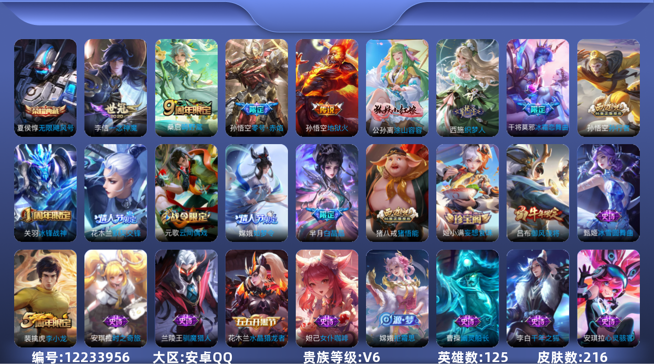 - [11684267]V9 3典藏 18传说 125英雄 332皮肤 典藏英雄武则天 可修改实名 荣耀水晶:鸣剑·曳影,全息碎影(猴子典藏),杀手不太冷 传说皮:黄金狮子座,黄金射手座,仲夏夜之梦(大飞蛾),海洋之心,地狱之眼,一念神魔,久胜战神,云鹰飞将(小将军),炽阳神光,超时空战士-狄仁杰 珍宝阁皮:妄想食味,优雅恋人,玩趣恶龙 限定皮:鸣野蒿,至尊宝,白虎志(电光耗子),凤求凰(白切鸡),太华(伽罗年限),梅西,白晶晶,时雨天司(水龙头),神威(电光马子),遇见飞天,高山流水,五谷丰年,冰锋战神,天狼运算者,游园惊梦,梁祝,御风骁将(吕布年限),祈雪灵祝(雪兔子),李小龙,逐梦之影,辉光之辰,霸王别姬-项羽,纯白花嫁,猪悟能,一生所爱,大圣娶亲,天魔缭乱,青春决赛季,冰霜恋舞曲 史诗皮:鸭鸭历险记-刘禅,龙之律动,百相守梦-黄忠,怒海争锋,百相守梦-周瑜,幻珠鲛人,遇见神鹿,紫霞仙子,苍穹之光,电玩小子(小书包),白龙吟,黄金分割率,特工魅影,千年之狐,永昼,末日机甲-莱西奥,蒙恬荣光圣徽,冰冠公主,偶像歌手,晚萤,魅语,暗夜猫娘,末日机甲-吕布,猫狗日记-孙策,猫狗日记-大乔,乱世虎臣,节奏热浪,修罗,女仆咖啡,摇滚巨星,水果甜心,绅士熊喵,天才门将,星夜王子,心灵骇客,功夫厨神,德古拉伯爵,暗隐猎兽者,幽灵船长,鬼剑武藏,心灵战警,天秀·启明,舞动绿茵,地狱岩魂,纤云弄巧,繁星吟游(呼啦呼啦),拒霜思,缤纷独角兽,乘风破浪,逐浪之夏,水晶猎龙者,曙光守护者,箭羽风息,金属风暴,原初追逐者,圣诞狂欢,圣诞恋歌,鹰眼统帅,暗夜贵公子,魅力维加斯,黎明之约,赏金猎手,奇遇舞章,无心,未来纪元-赵云