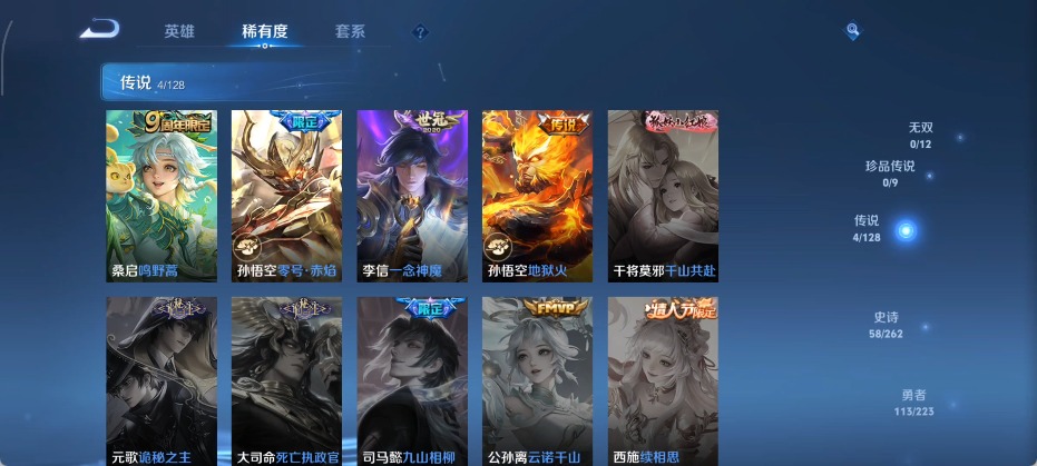 - PX_2096134-17 安卓QQ/无双王者/300皮肤/124英雄/3典藏/0珍品无双/0无双/3珍品传说/28传说/96史诗/8稀有英雄 【3 珍品传说】怪盗基德 马可波罗,时之奇旅 孙策,器灵·落星盏 嫦娥, 【3 典藏皮肤】幻阙歌 貂蝉,神鉴启示录 虞姬,最初的交响 伽罗, 【28 传说皮肤】启明星使 虞姬,逐花归海 澜,诗剑行 李白,浮生妄 夏洛特,地狱之眼 宫本武藏,炽阳神光 镜,遇