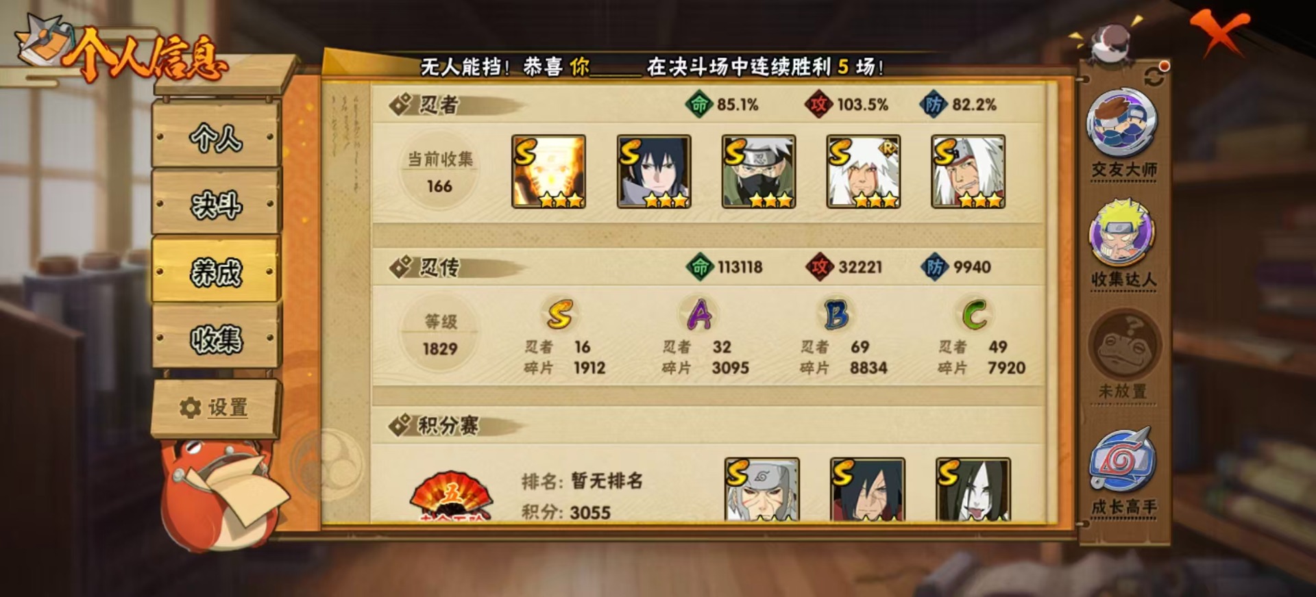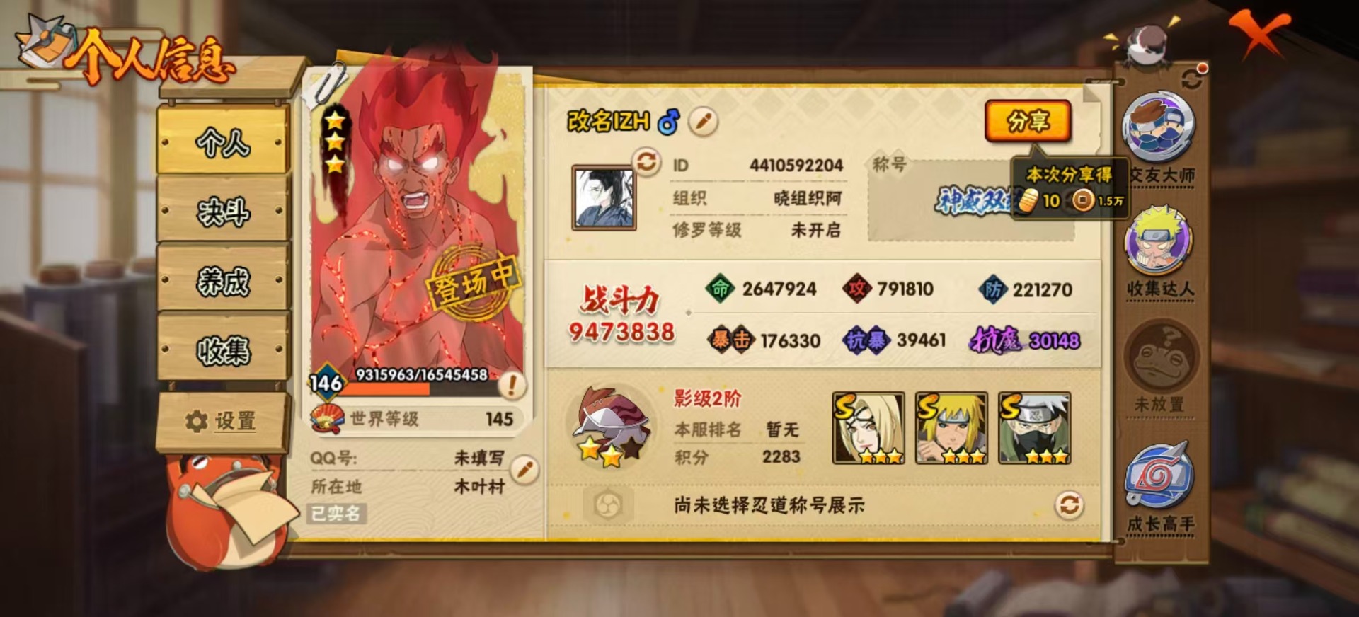 [12233979]V5 16S忍 32A忍 17通灵 947.3W战力 可二次 可修改实名 优质装备:千手扉间「秽土转生」,纲手「百豪」,波风水门「秽土转生」,猿飞日斩「秽土转生」,迈特凯「死门」,漩涡鸣人 「九喇嘛连结」,宇智波佐助「永恒万花筒」,宇智波斑「秽土转生·解」,艾「忍界大战」,旗木卡卡西「须佐能乎」 S级忍者:自来也 「舞之豪杰」,宇智波鼬 「须佐能乎」,佩恩「天道」,波风水门,大蛇丸,自来也