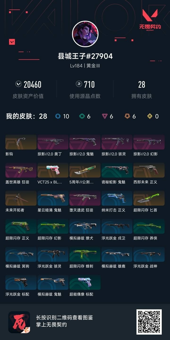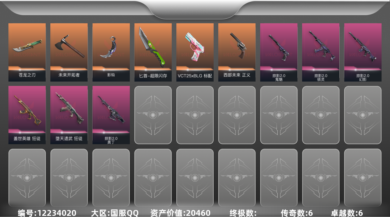 [12234020]6橙皮 6紫皮 28皮肤 26英雄 76卡面 710已用源晶 黄金 优质装备:狂徒-盖世英雄,匕首-超限闪存,未来开拓者,苍龙之刃,影钩 套装:掠影2.0套装 佩枪皮肤:标配-VCT25xBLG,鬼魅-掠影2.0,正义-西部未来 冲锋枪皮肤:骇灵-掠影2.0 步枪皮肤:幻影-掠影2.0,狂徒-堕天遗武 机枪皮肤:奥丁-掠影2.0