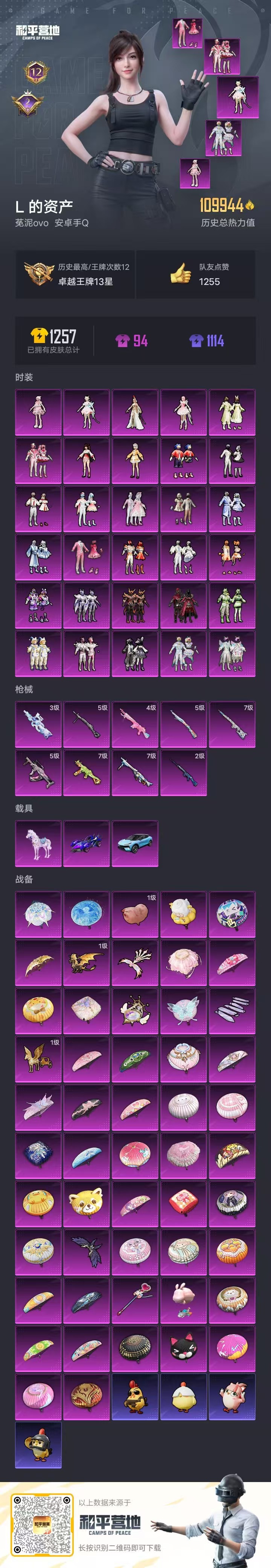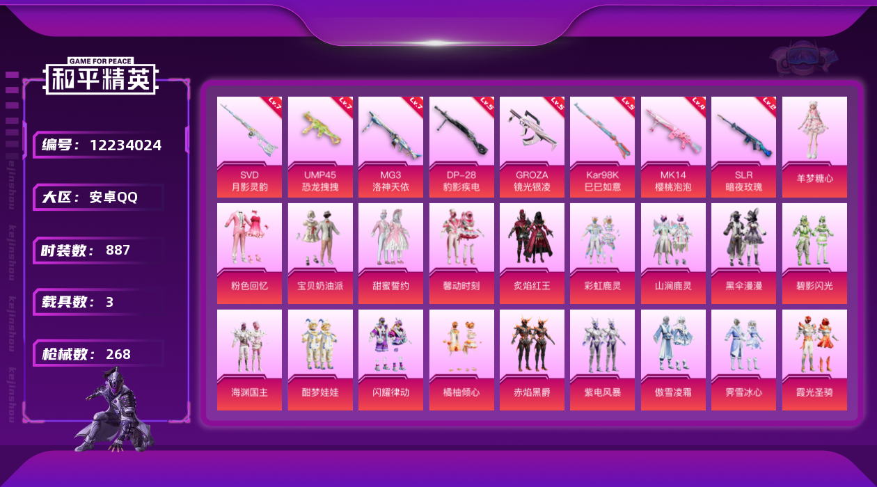 [12234024]30粉装 9特效枪 3载具 12印记 可二次 可修改实名 身法装备:暗影哥特(红眼罩) 优质装备:晶梦灵驹,海龙奔腾,路特斯ELETRE(冰川蓝),MG3洛神天依,宝贝奶油派,粉色回忆,甜蜜誓约,炙焰红王,馨动时刻,SLR暗夜玫瑰,UMP45恐龙拽拽,七级UMP45-恐龙拽拽,七级MG3-洛神天依,GROZA-镜光银凌,SVD-月影灵韵,七级SVD-月影灵韵,萨利娅,晶梦幻蝶,MK14-樱桃泡泡,羊梦糖心,Kar98K-巳巳如意 热门装扮:彩虹鹿灵,山涧鹿灵,黑伞漫漫,酣梦娃娃,碧影闪光,海渊国主,紫电风暴,赤焰黑爵,闪耀律动,橘柚倾心,霞光圣骑,寒光使者,傲雪凌霜,霁雪冰心,旋转彩虹,冰川红玫,冰川幽秘,音爆索尼克,呆萌星弥,小可学妹,闲梦青缨,美雪,兔兔白日梦,神秘黑猫,胖达圆圆,奶芙汪汪,激萌罗小黑,恶魔喵喵,爱崽白熊,浪漫波比 载具:僚机-萌兔起飞 稀有枪皮:DP-28-豹影疾电 五级特效枪:五级GROZA-镜光银凌,五级Kar98K-巳巳如意,五级DP-28-豹影疾电 四级特效枪:四级MK14-樱桃泡泡 二级特效枪:二级SLR-暗夜玫瑰 紫色装扮:幻彩翩翩,SS23特训,妙红点点,SS30特训套装,SS31特训套装,SS33特训套装,旭日情侣,SS21特训,熠彩粉晶,紫芒星,岑岑玉浪,星夜迷魅,琉璃情波,田园牧歌,轻风白浪,和煦暖阳,SS22特训,香榭午后,顶瓜瓜,冷焰舞者,北国孤狼,千禧之恋,吉莉礼服,夏日音浪,完美偶像,帅气教官,幻世战舞者,幻影武者,萌趣咩咩,军械专家,灵幻魔术师,娇憨猪猪,海龙战士,冰爽风暴,爆裂葡萄,瑞龙福将,团圆交子,SS17特训,SS14特训,萌趣颜团子,特种颜团子,星河入梦,SS15特训,极乐追光,浓情摩卡,SS20特训,醇脆可可,香草威化,浑天鲲鹏,甜心亚梦,虚音幻奏,猎梦纪元,粉团憨憨,梦幻奶油,酸甜橘柚,奶油香芋,樱桃黑巧,怒火燎原,夏雨游龙,软羊咩咩,魔力冰咖,沁蓝冰爽,冰川谧蓝,焰山流火,绿翡凌光,月蓝流光,异彩先驱,缤纷焰火,SS18特训,水晶王族,雪兔飞飞,茉莉之诺,风铃甜诗,飞驰魅影,音速流光,SS19特训,圣诞惊喜,沙暴悍客,青年教官,风暴特警,飞行日记,骑行爱好者,魅力单车,鹤鸣,麻辣教官,黄色运动,黑色伏地魔,龙的传人,冰河战士,龙魂突击队,蝶变,香桃花海,霓虹街区,酷潮明星,都市魅力,霓虹极客,野性