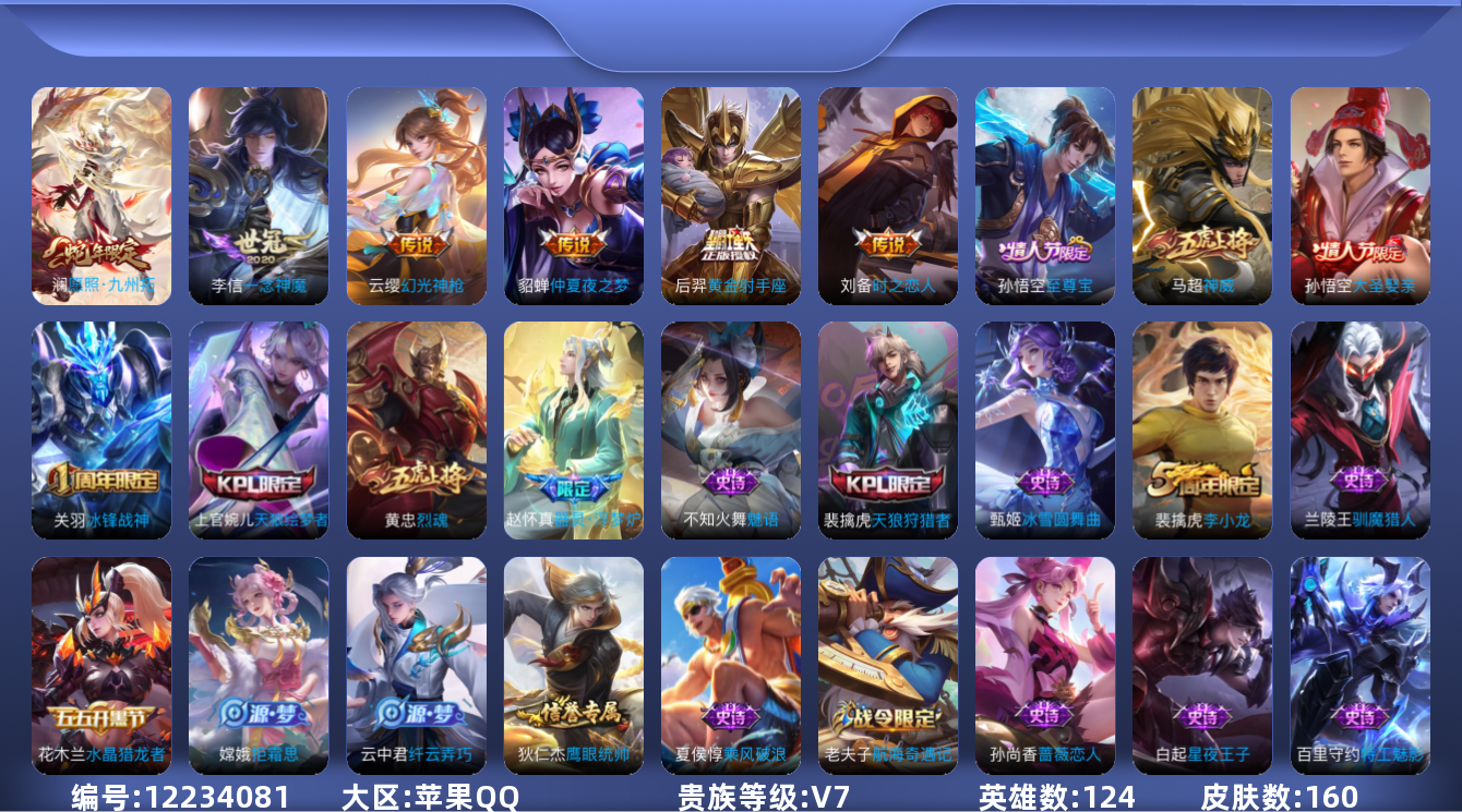 - [11445648]V7 1典藏 2珍品传说 9传说 124英雄 269皮肤 可修改实名 优质装备:鸣剑·曳影,大耳狗之梦,云鹰飞将(小将军),一念神魔,音你闪耀(rap皮),惊梅引,玄雷天君 珍品传说:时之奇旅-孙策 传说皮:幻光神枪 珍宝阁皮:优雅恋人,蔷薇恋人 限定皮:愿照·岁时盈(虞姬年限),逐霄战戟,鸣野蒿,夏侯惇霜北刀,梁祝,天狼溯光者,李小龙,逐梦之影,大圣娶亲 史诗皮:鸭鸭历险记-刘禅,器灵·浮梦炉,化蝶舞,星界战将,龙之律动,石田雨龙,茶境仙,撼地雄心,破空之剑,蒙犽顽岩魄,百相守梦-百里守约,百相守梦-黄忠,紫霞仙子,黄金分割率,特工魅影,千年之狐,银翎春语,蒙恬荣光圣徽,偶像歌手,白蛇,魅语,晚萤,青蛇,末日机甲-吕布,猫狗日记-孙策,猫狗日记-大乔,时之恋人-孙尚香,乱世虎臣,节奏热浪,修罗,女仆咖啡,摇滚巨星,水果甜心,绅士熊喵,天才门将,星夜王子,功夫厨神,暗隐猎兽者,幽灵船长,鬼剑武藏,乐园奇幻夜,天秀·启明,舞动绿茵,地狱岩魂,纤云弄巧,繁星吟游(呼啦呼啦),拒霜思,乘风破浪,水晶猎龙者,热力回旋,箭羽风息,圣诞恋歌,鹰眼统帅,暗夜贵公子,魅力维加斯,黎明之约,赏金猎手,奇遇舞章,天秀·音浪