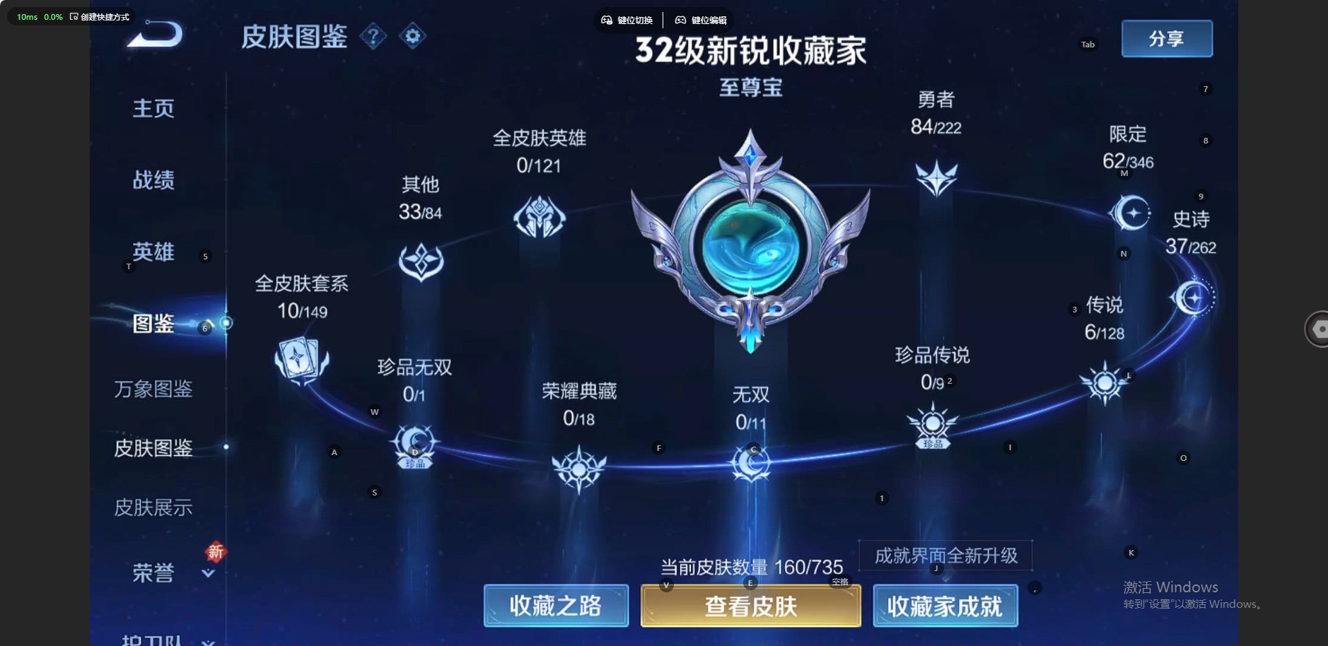 - PX_2082773-贵族等级: V9 英雄数: 124 皮肤数: 331 荣耀水晶: 鸣剑·曳影,星域神启 传说皮: 黄金狮子座,黄金射手座,冠军飞将,云鹰飞将,黄金白羊座,猫影幻舞,久胜战神,炽阳神光,一念神魔,云霓雀翎,仲夏夜之梦,零号·赤焰,地狱之眼,飞鸢探春,音你心动-周瑜,胖达荣荣,李逍遥,游龙清影,淬星耀世,超时空战士-狄仁杰,末日机甲-孙策,挚爱之约,挚爱花嫁,无双飞将,碎云,神器