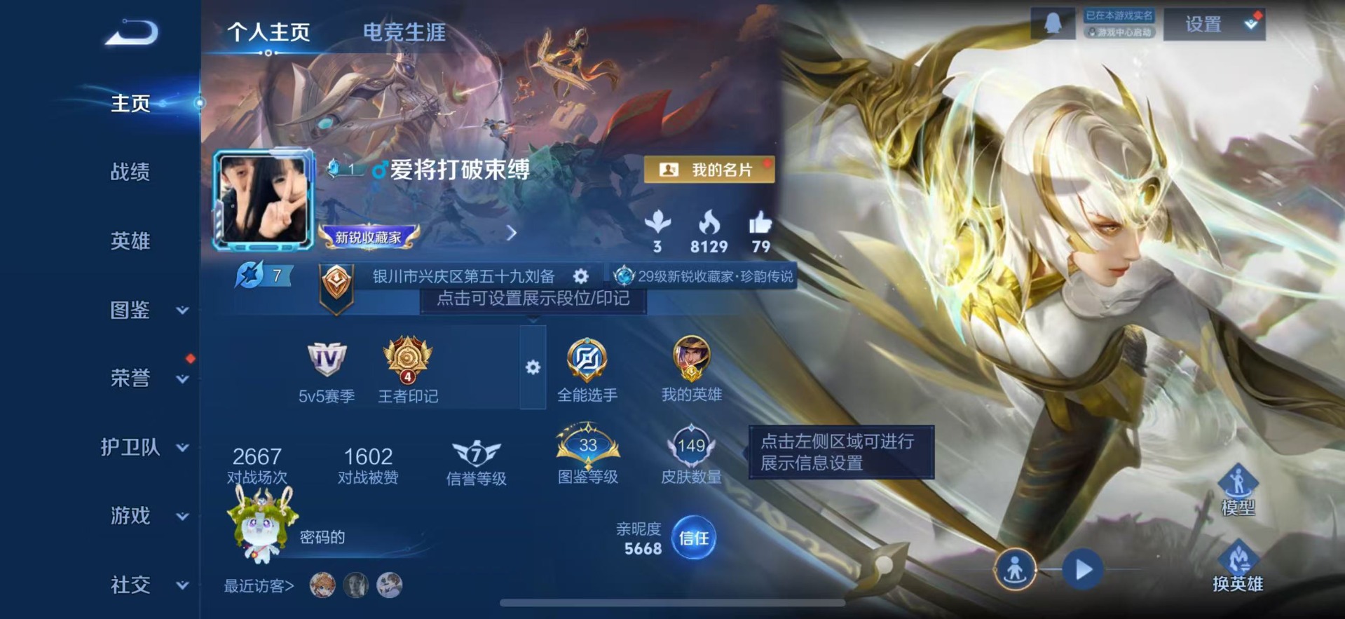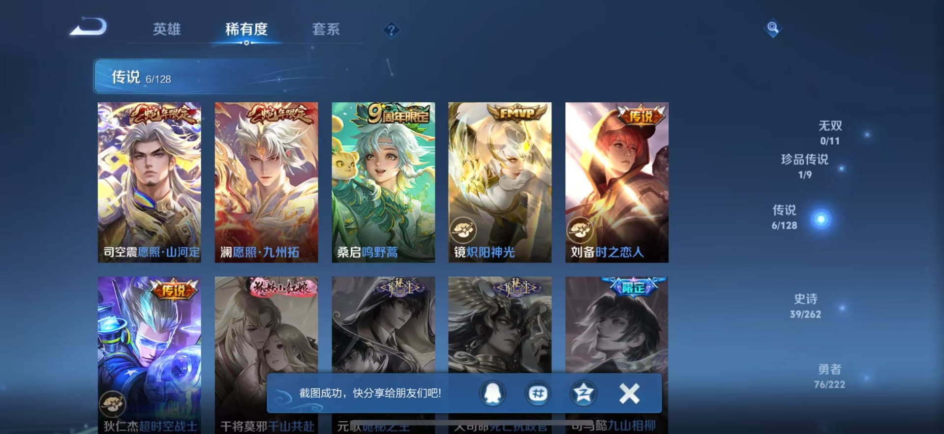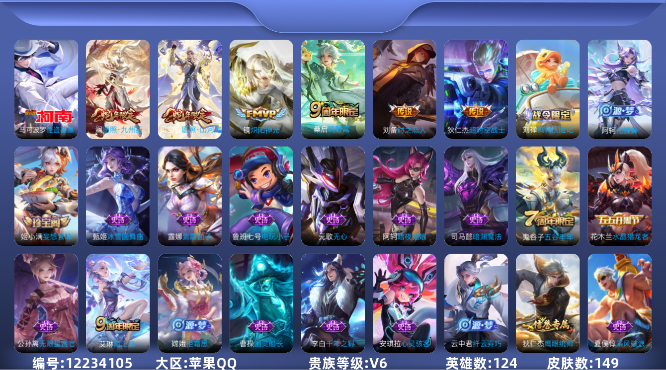 [12234105]V6 1珍品传说 6传说 124英雄 149皮肤 可修改实名 优质装备:怪盗基德,炽阳神光,时之恋人-刘备(电焊工),超时空战士-狄仁杰 珍宝阁皮:妄想食味 限定皮:愿照·九州拓(澜年限),愿照·山河定(司空震年限),逐霄战戟,陌上桑,鸣野蒿,五谷丰年,梁祝 史诗皮:鸭鸭历险记-刘禅,化蝶舞,茶境仙,紫霞仙子,苍穹之光,电玩小子(小书包),特工魅影,千年之狐,冰冠公主,江河有灵,百解令(蒙犽),无限星赏官,偶像歌手,暗夜猫娘,乱世虎臣,水果甜心,心灵骇客,德古拉伯爵,幽灵船长,鬼剑武藏,暗渊魔法,天秀·启明,地狱岩魂,纤云弄巧,拒霜思,乘风破浪,逐浪之夏,水晶猎龙者,金属风暴,原初追逐者,鹰眼统帅,无心