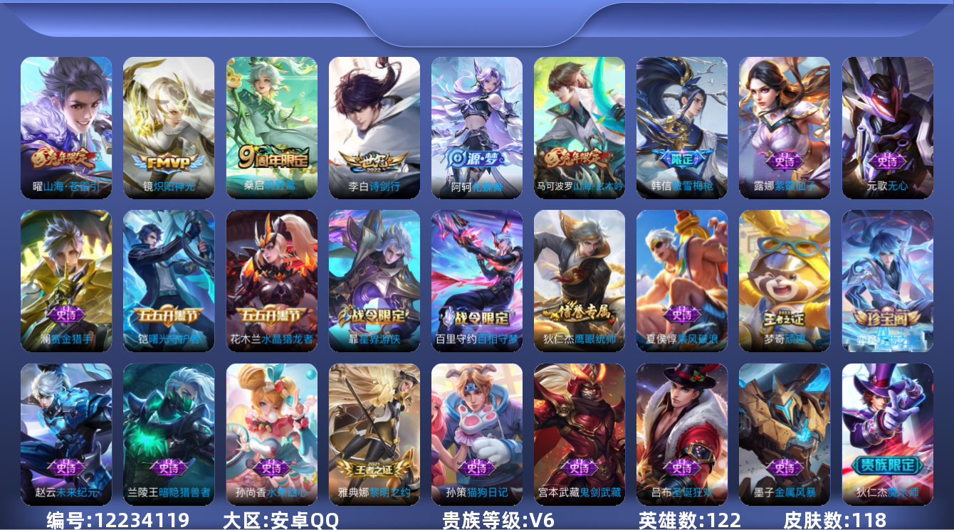- [11991907]V7 12传说 124英雄 228皮肤 可修改实名 社交场景限制 女号 优质装备:云鹰飞将(小将军),黄金白羊座,炽阳神光,零号·赤焰,时之恋人-刘备(电焊工),无双飞将,山海·炽霜斩(李信年限),霜月吟,涂山容容 传说皮:幻光神枪 珍宝阁皮:妄想食味 限定皮:愿照·九州拓(澜年限),逐霄战戟,鸣野蒿,至尊宝,飞衡(韩信年限),齐天大圣,梁祝,李小龙,山海·玄木吟(马可年限) 史诗皮:器灵·浮梦炉,化蝶舞,星界战将,谪仙醉月,龙之律动,石田雨龙,怒海争锋,蒙犽顽岩魄,芈月浮光幕影,上官婉儿群星魔术团,乘龙·聚宝船(安琪拉年限),遇见神鹿,紫霞仙子,特工魅影,高渐离燃音魔法,冰冠公主,电玩·爆裂旋风,末日机甲-吕布,猫狗日记-孙策,时之恋人-孙尚香,乱世虎臣,节奏热浪,修罗,女仆咖啡,水果甜心,绅士熊喵,功夫厨神,暗隐猎兽者,幽灵船长,鬼剑武藏,暗渊魔法,心灵战警,纤云弄巧,繁星吟游(呼啦呼啦),缤纷独角兽,乘风破浪,逐浪之夏,水晶猎龙者,曙光守护者,金属风暴,原初追逐者,圣诞狂欢,圣诞恋歌,鹰眼统帅,魅力维加斯,赏金猎手,无心,未来纪元-赵云
