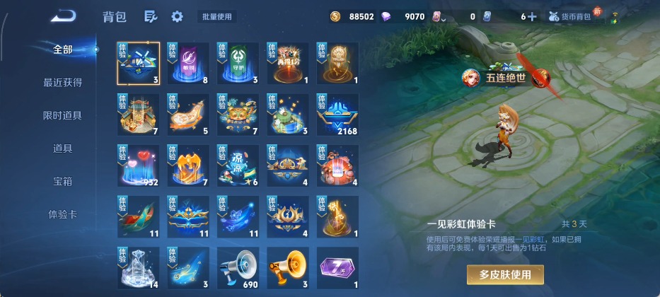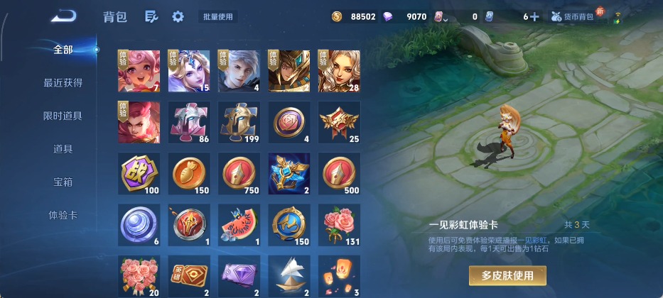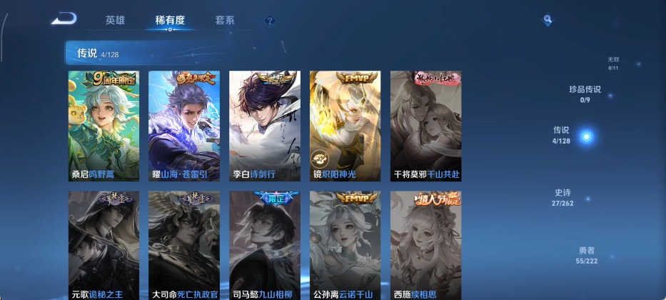 宫本武藏鬼剑武藏,兰陵王暗隐猎兽者,夏侯惇乘风破浪,花木兰水晶猎龙者,铠曙光守护者,孙策猫狗日记,雅典娜黎明之约,李元芳逐浪之夏,墨子金属风暴,吕布圣诞狂欢,露娜紫霞仙子,澜赏金猎手,刘禅天才门将
