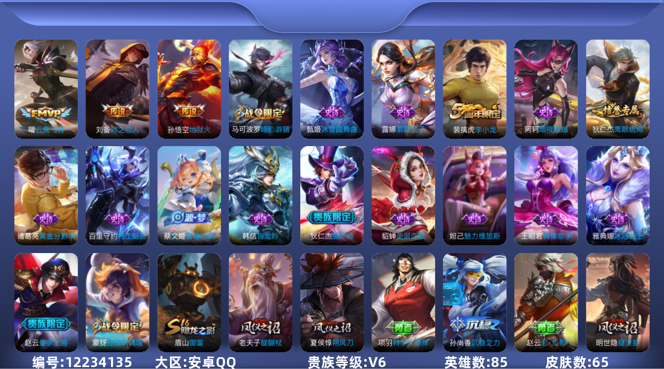 [12234135]V6 3传说 85英雄 65皮肤 可修改实名 优质装备:云鹰飞将(小将军),地狱火,时之恋人-刘备(电焊工) 限定皮:李小龙 史诗皮:紫霞仙子,白龙吟,黄金分割率,特工魅影,冰冠公主,偶像歌手,暗夜猫娘,繁星吟游(呼啦呼啦),圣诞恋歌,鹰眼统帅,魅力维加斯