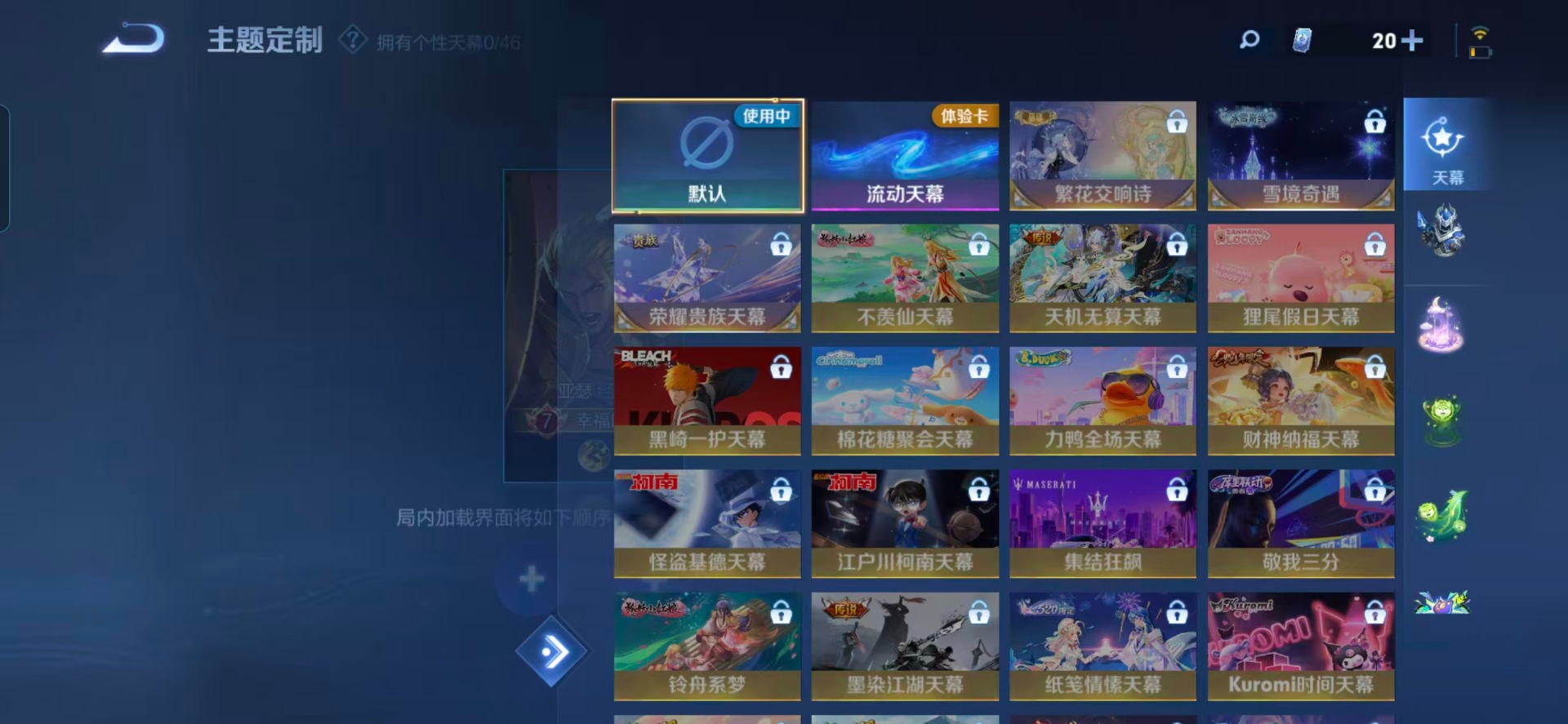 大乔白蛇,大乔猫狗日记,刘邦德古拉伯爵,阿轲节奏热浪,伽罗箭羽风息,廉颇地狱岩魂,伽罗琥珀纪元,小乔缤纷独角兽,小乔青蛇,孙尚香时之恋人,孙策猫狗日记,赵怀真器灵·浮梦炉,吕布圣诞狂欢,诸葛亮黄金分割率,刘禅电玩·爆裂旋风,宫本武藏鬼剑武藏,公孙离无限星赏官,兰陵王暗隐猎兽者,貂蝉圣诞恋歌,貂蝉唤灵魅影,李白谪仙醉月,花木兰水晶猎龙者,安琪拉心灵骇客,蒙犽百解令,艾琳奇遇舞章,西施诗语江南,亚瑟心灵战警,百里守约特工魅影,李元芳逐浪之夏,墨子金属风暴,蔡文姬舞动绿茵,王昭君偶像歌手,嫦娥拒霜思