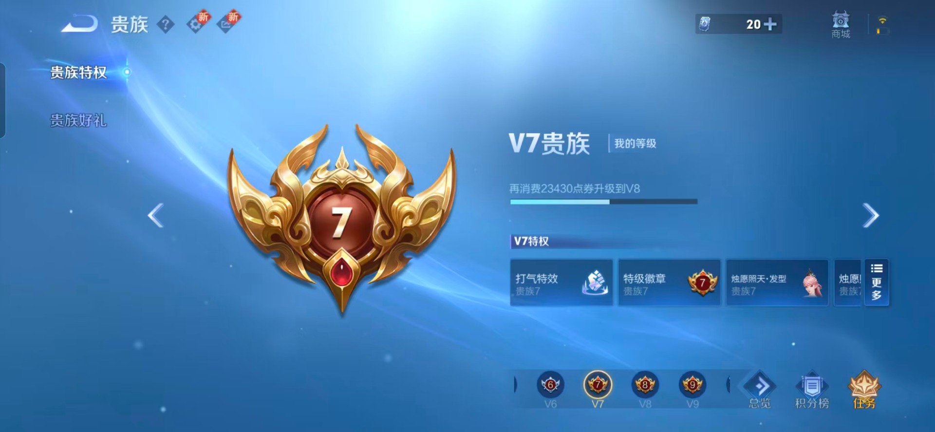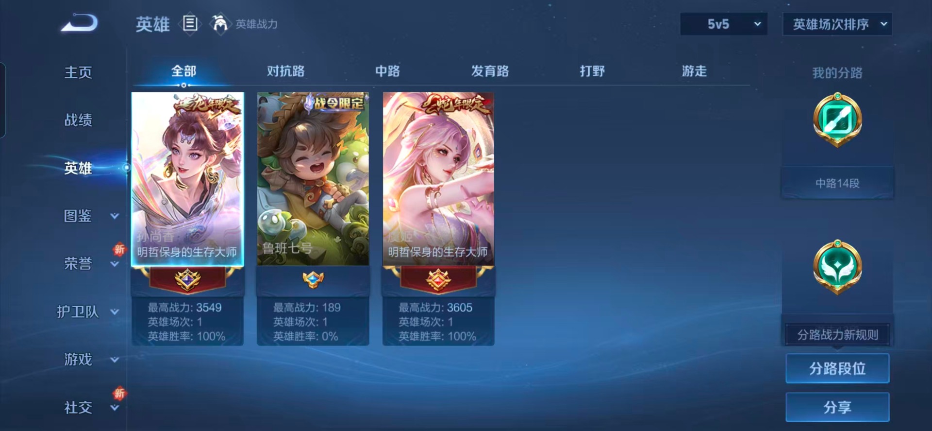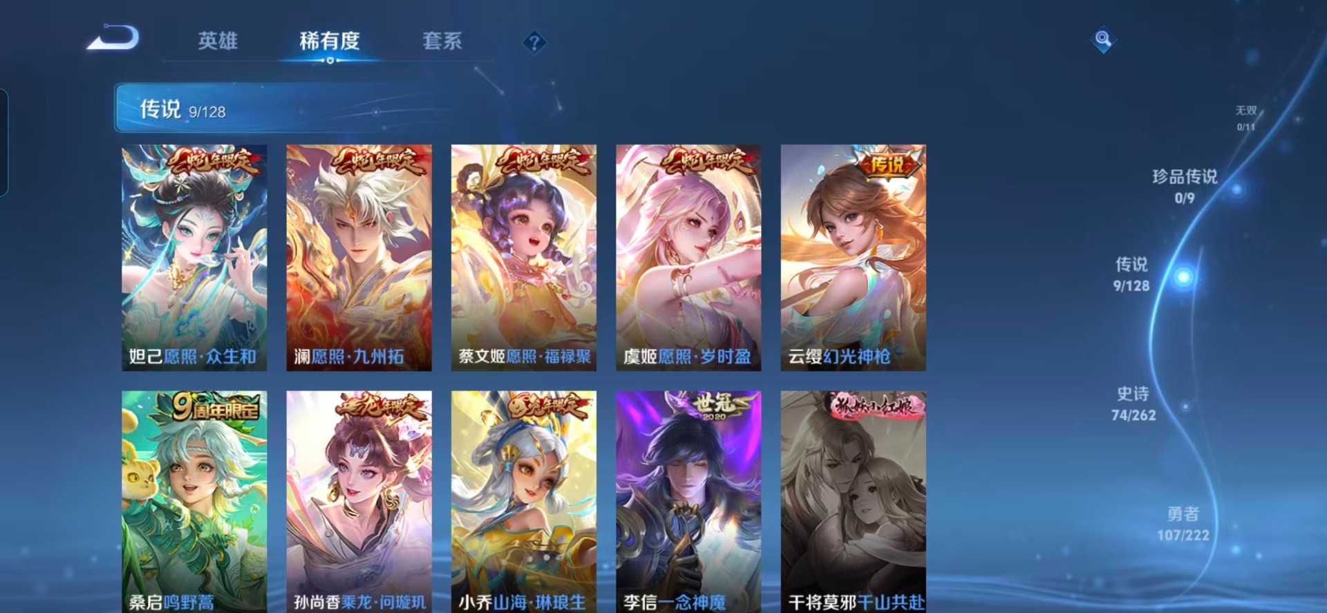 - PX_2062092-贵族等级: V5 英雄数: 112 皮肤数: 88 传说皮: 一念神魔,无双飞将,澜逐花归海 限定皮: 李小龙,神器·万象笔,鸣野蒿,愿照·九州拓