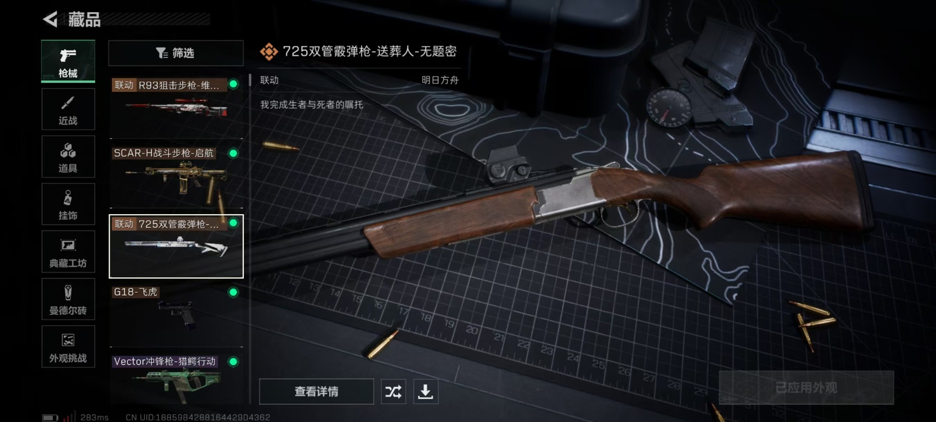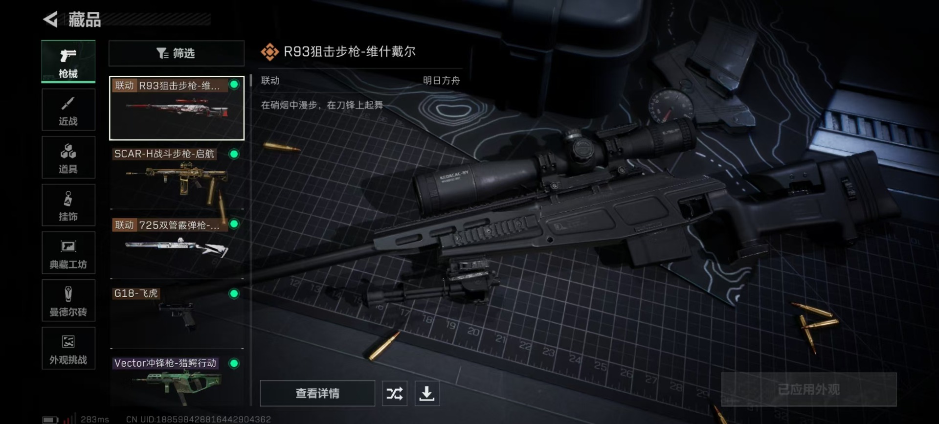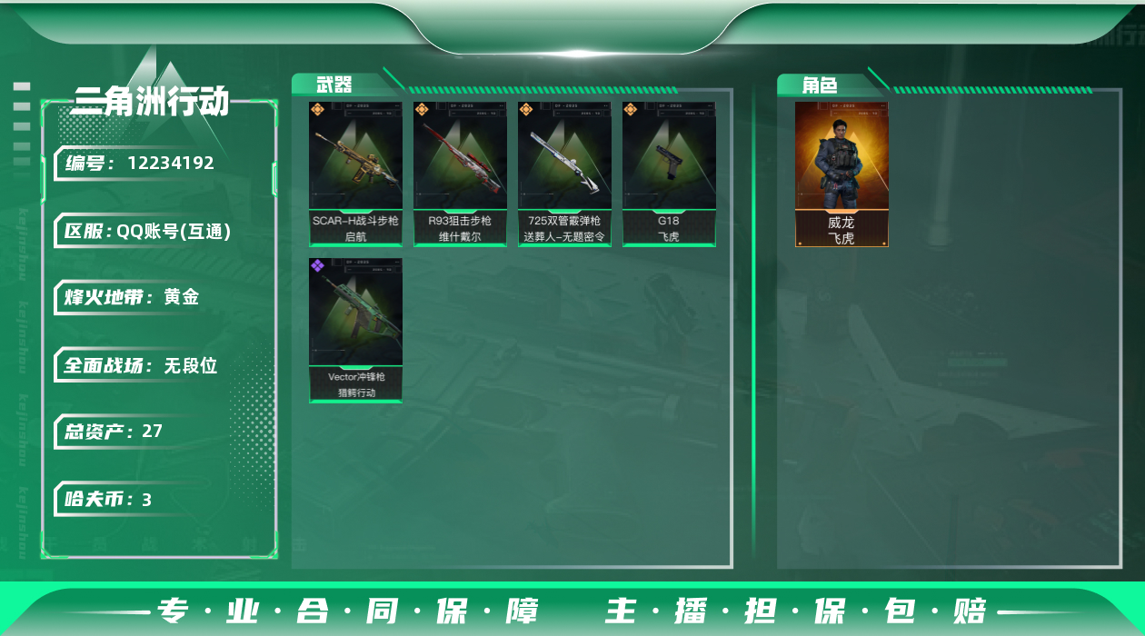 [12234192]总资产:27.4M 1干员外观 4传说枪械 哈夫币:3.162K 可二次 可修改实名 烽火地带段位:黄金 全面战场段位:无段位 传说武器皮肤:R93狙击步枪-维什戴尔,SCAR-H战斗步枪-启航,725双管霰弹枪-送葬人-无题密令,G18-飞虎 史诗武器皮肤:Vector冲锋枪-猎鳄行动 干员外观:威龙-飞虎
