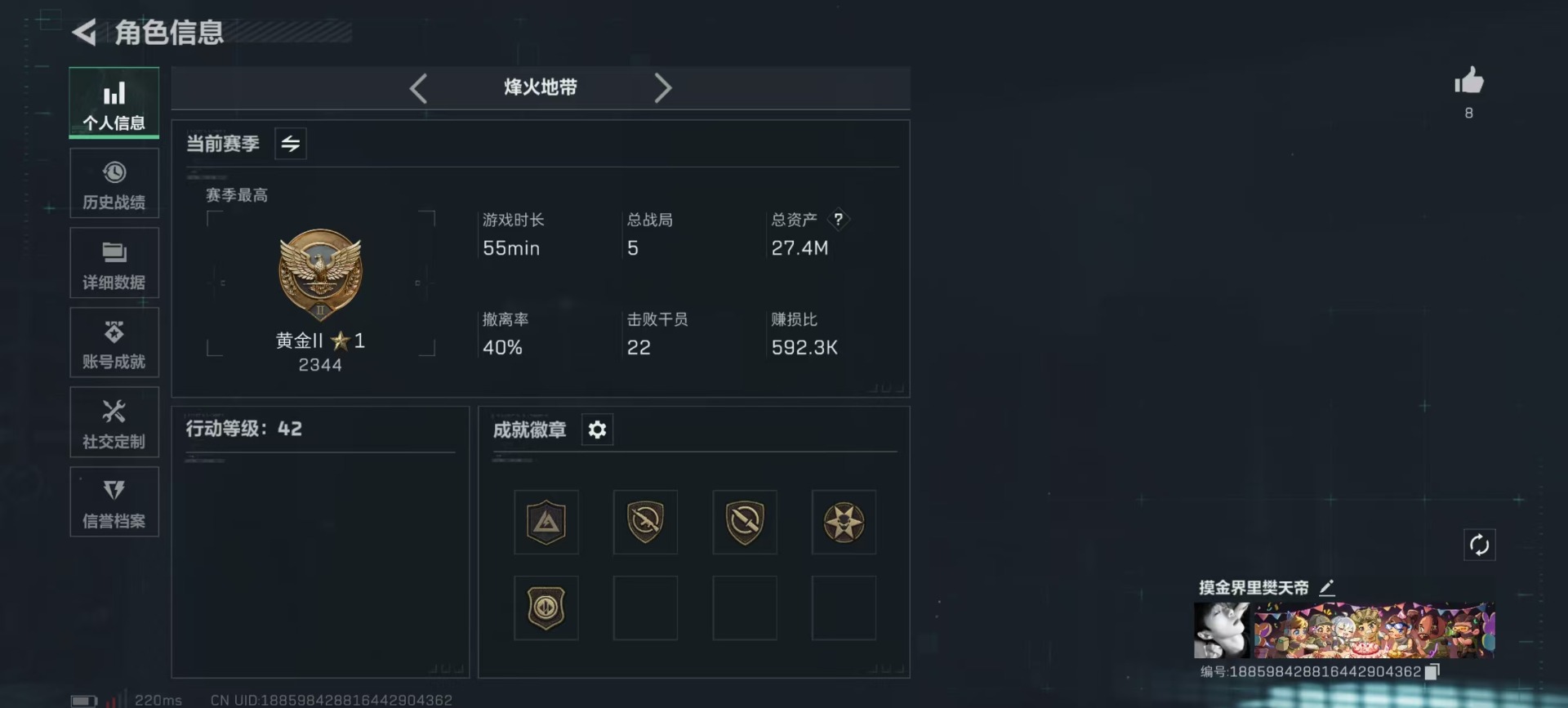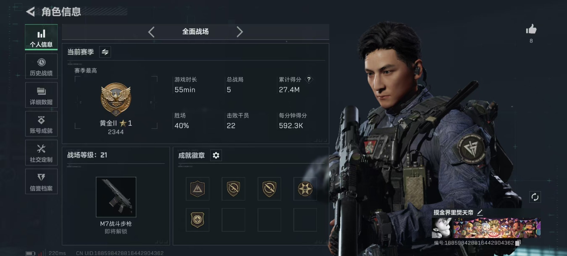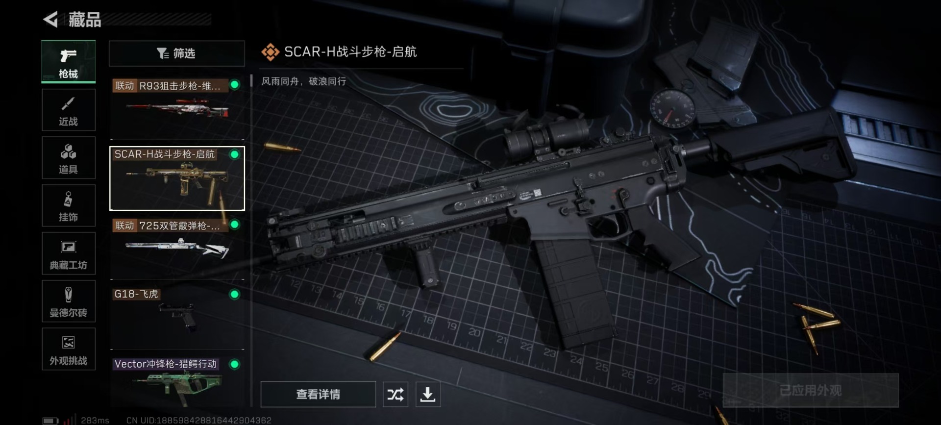 [12234192]总资产:27.4M 1干员外观 4传说枪械 哈夫币:3.162K 可二次 可修改实名 烽火地带段位:黄金 全面战场段位:无段位 传说武器皮肤:R93狙击步枪-维什戴尔,SCAR-H战斗步枪-启航,725双管霰弹枪-送葬人-无题密令,G18-飞虎 史诗武器皮肤:Vector冲锋枪-猎鳄行动 干员外观:威龙-飞虎