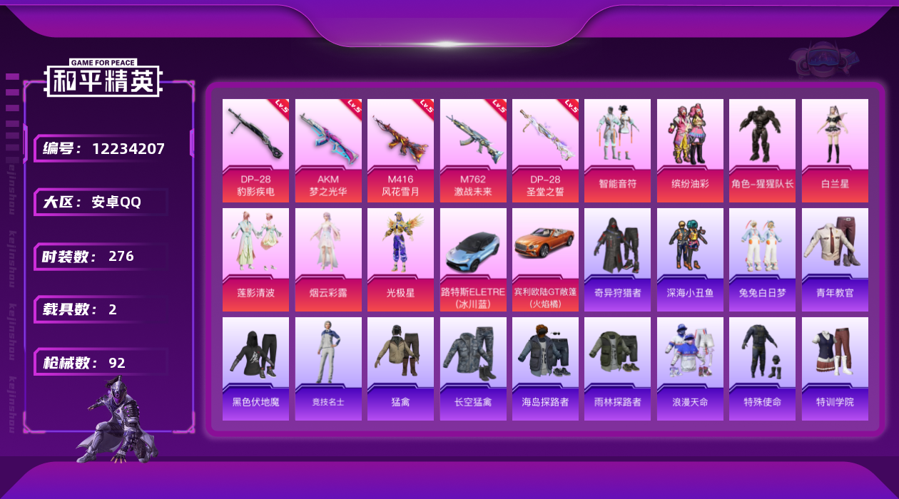 [12234207]7粉装 5特效枪 2载具 6印记 可二次 可修改实名 身法装备:暗影哥特(红眼罩),8号机(新粉螳螂),Mark.06(新蓝螳螂) 优质装备:路特斯ELETRE(冰川蓝),宾利欧陆GT敞篷(火焰橘),奇异狩猎者,智能音符,缤纷油彩(猪妹猪脸妹),M762激战未来,AKM梦之光华,M416风花雪月,DP-28圣堂之誓 热门装扮:猩猩队长,白兰星,莲影清波,烟云彩露,光极星,兔兔白日梦,深海小丑鱼 稀有枪皮:DP-28-豹影疾电 五级特效枪:五级M762-激战未来,五级DP-28-豹影疾电,五级DP-28-圣堂之誓,五级M416-风花雪月,五级AKM-梦之光华 紫色装扮:SS30特训套装,SS23特训,SS22特训,千禧之恋,幻世战舞者,幻影武者,冰川特警,天籁歌者,SS21特训,SS20特训,龙的传人,魅力单车,鹤鸣,黑色伏地魔,龟仙人,冰河战士,龙魂突击队,蝶变,长空猛禽,雨林探路者,霓虹街区,青年教官,探宝勇士,特殊使命,涂山之恋,海岛探路者,特训学院,缤纷果语,血色贵族,猛禽,甜蜜菠萝,疯狂小兔子,福星高照,空岛之星,多纳泰罗,曼妙人鱼,SS28特训,创世·幻影,8号机(新粉螳螂),Mark.06(新蓝螳螂),纯真浪花,玉兔迎春,竞技名士,暗影哥特(红眼罩),热情海星,惊鸿侠骨,SS24特训(SS24特训套装),SS25特训,锦衣飞扬,焰鹰斗篷,幻羽潜行,幽夜迷踪,SS27特训,Alan Walker,蝶吟花词,湖雨初晴,明鸳圣池,浪漫天命,无暇誓言,云霞荷露,SS26特训,春光漫游,快闪甜心,贝斯之夜,光之冒险,冰冻风暴 优质战备:圣堂之誓降落伞,初号机 觉醒Ver.降落伞,莲影清波降落伞,沙丘之主天马飞行器,沙丘之主降落伞,未来歌姬降落伞