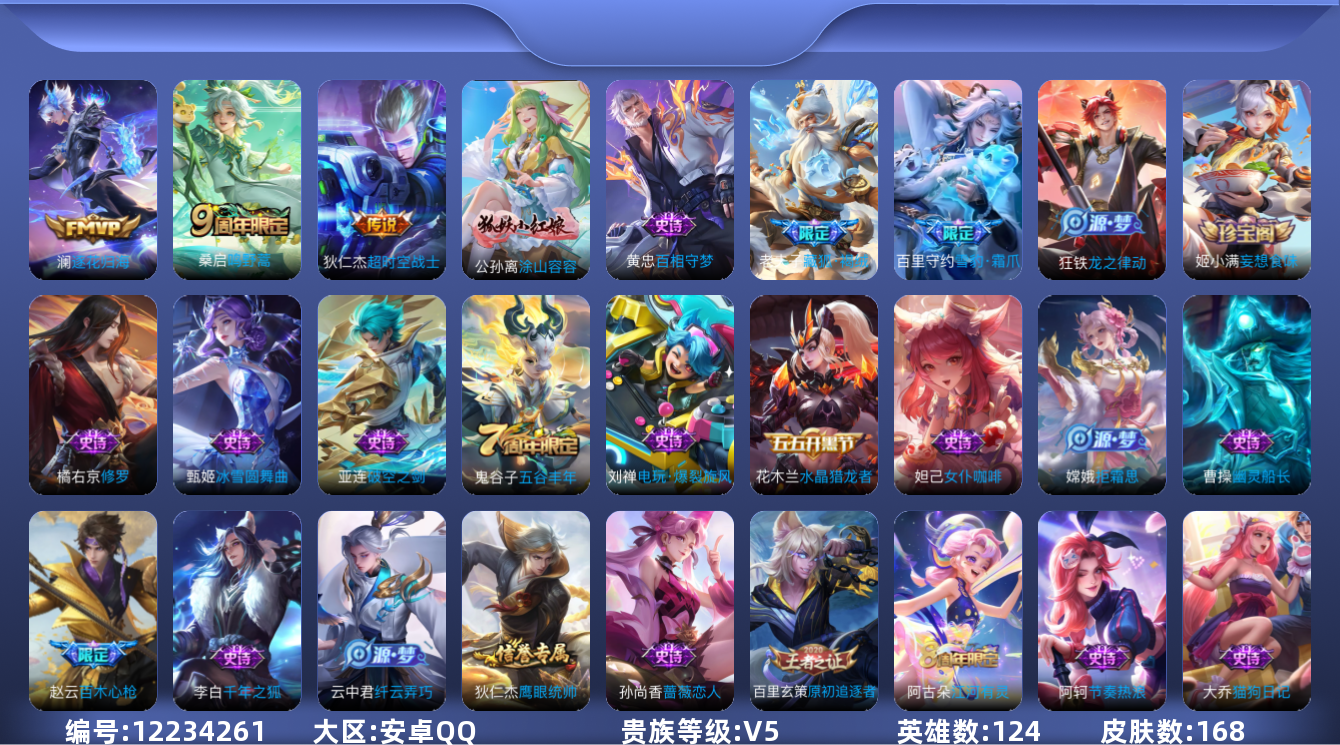 [12234261]V5 3传说 124英雄 168皮肤 可修改实名 优质装备:超时空战士-狄仁杰,澜逐花归海,涂山容容 珍宝阁皮:妄想食味,蔷薇恋人 限定皮:鸣野蒿,高山流水,五谷丰年,百木心枪 史诗皮:星界战将,龙之律动,雪豹·霜爪,藏狐·褐绒,破空之剑,蒙犽顽岩魄,百相守梦-黄忠,千年之狐,江河有灵,电玩·爆裂旋风,猫狗日记-孙策,猫狗日记-大乔,节奏热浪,修罗,女仆咖啡,水果甜心,绅士熊喵,德古拉伯爵,暗隐猎兽者,幽灵船长,鬼剑武藏,心灵战警,舞动绿茵,地狱岩魂,纤云弄巧,拒霜思,逐浪之夏,水晶猎龙者,金属风暴,原初追逐者,圣诞恋歌,鹰眼统帅