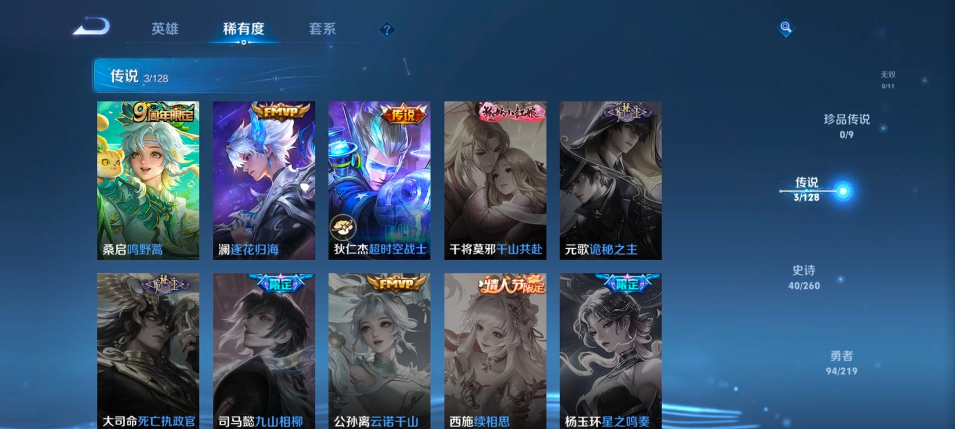 - [11687849]V7 1典藏 6传说 124英雄 280皮肤 可修改实名 优质装备:大秦宣太后,久胜战神,炽阳神光,地狱火,超时空战士-狄仁杰 珍宝阁皮:优雅恋人,玩趣恶龙 限定皮:鸣野蒿,至尊宝,时雨天司(水龙头),飞衡(韩信年限),瑞麟志(木兰年限),遇见飞天,五谷丰年,青龙志(铠年限),冰锋战神,天狼运算者,李小龙,朱雀志(守约年限),霸王别姬-虞姬,大圣娶亲 史诗皮:鸭鸭历险记-刘禅,化蝶舞,星界战将,龙之律动,石田雨龙,茶境仙,破空之剑,蔬乡物语(鲁班七号),百相守梦-百里守约,百相守梦-黄忠,紫霞仙子,白龙吟,黄金分割率,特工魅影,千年之狐,永昼,江河有灵,魅语,百解令(蒙犽),蒙恬荣光圣徽,匿光破解者,青蛇,偶像歌手,白蛇,电玩·爆裂旋风,暗夜猫娘,末日机甲-吕布,猫狗日记-孙策,猫狗日记-大乔,时之恋人-孙尚香,乱世虎臣,节奏热浪,女仆咖啡,摇滚巨星,水果甜心,绅士熊喵,天才门将,星夜王子,心灵骇客,功夫厨神,德古拉伯爵,暗隐猎兽者,幽灵船长,鬼剑武藏,心灵战警,天秀·启明,舞动绿茵,纤云弄巧,繁星吟游(呼啦呼啦),拒霜思,缤纷独角兽,乘风破浪,逐浪之夏,水晶猎龙者,曙光守护者,箭羽风息,金属风暴,圣诞狂欢,圣诞恋歌,鹰眼统帅,暗夜贵公子,魅力维加斯,黎明之约,未来纪元-赵云