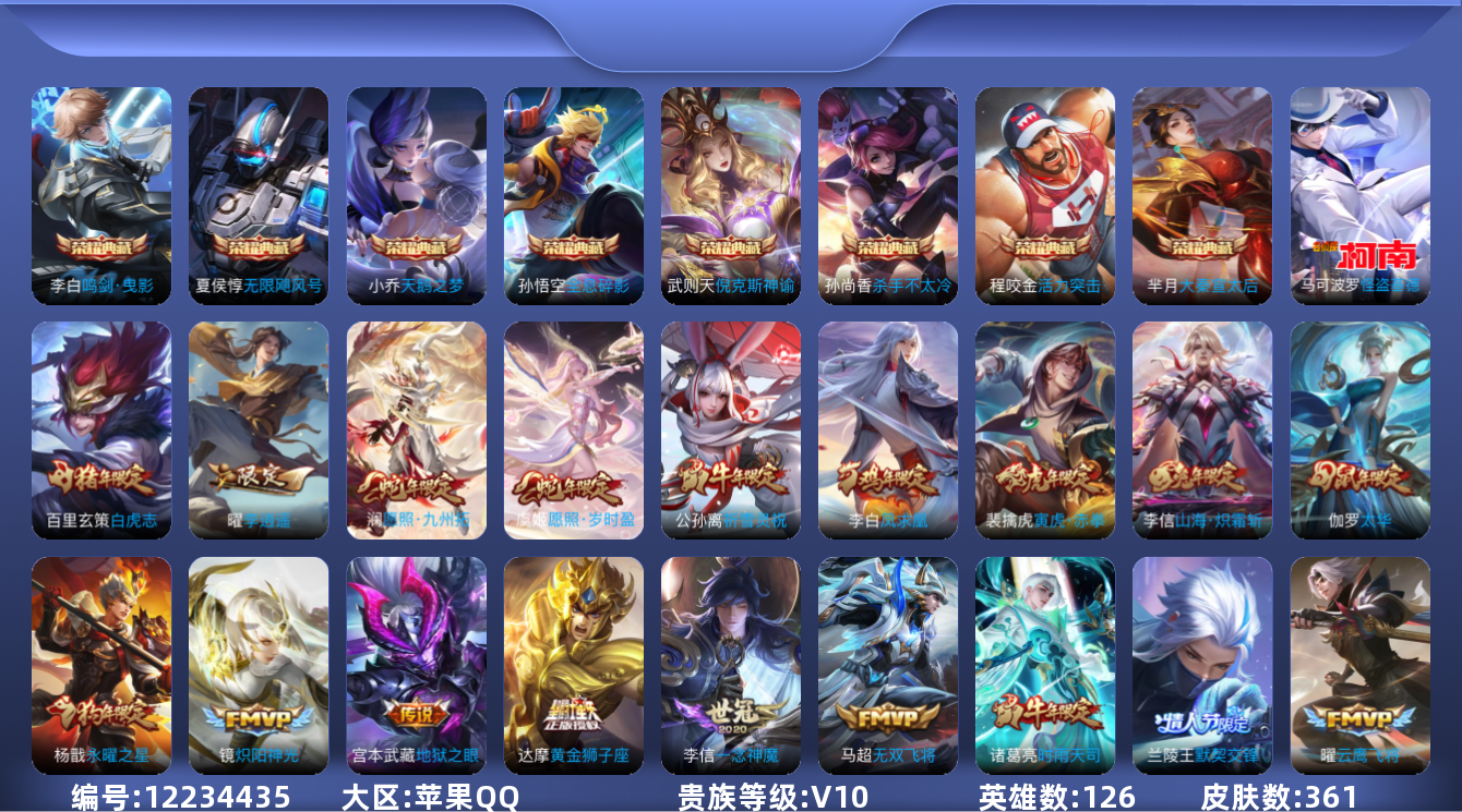 [12234435]V10 8典藏 1珍品传说 44传说 126英雄 361皮肤 典藏英雄武则天 可修改实名 优质装备:天鹅之梦(小乔典藏),倪克斯神谕(宇宙婆娘),无限飓风号(高达),活力突击,杀手不太冷,大秦宣太后,鸣剑·曳影,全息碎影(猴子典藏),怪盗基德,黄金狮子座,黄金射手座,冠军飞将,云鹰飞将(小将军),绛天战甲(鸡嘴战神),黄金白羊座,久胜战神,炽阳神光,一念神魔,云霓雀翎,地狱火,仲夏夜之梦(大飞蛾),音你心动-小乔,零号·赤焰,地狱之眼,飞鸢探春,音你心动-周瑜,胖达荣荣,李逍遥,乞巧织情,时之恋人-刘备(电焊工),游龙清影(小青龙),淬星耀世,超时空战士-狄仁杰,末日机甲-孙策,无双飞将,山海·炽霜斩(李信年限),艾琳觅芳踪,玄雷天君,涂山容容 传说皮:幻光神枪 珍宝阁皮:胡桃夹子,蔷薇恋人 限定皮:愿照·九州拓(澜年限),愿照·岁时盈(虞姬年限),逐霄战戟,鸣野蒿,至尊宝,白虎志(电光耗子),凤求凰(白切鸡),凤凰于飞,太华(伽罗年限),傲雪梅枪,白鹤梁神女,白晶晶,时雨天司(水龙头),高山流水,怒海麟威,青龙志(铠年限),冰锋战神,武圣,天狼运算者,梁祝,御风骁将(吕布年限),龙胆,逐梦之星,岱宗(典韦年限),天狼溯光者,奔雷神使(牛魔年限),祈雪灵祝(雪兔子),李小龙,逐梦之影,逐梦之光,朱雀志(守约年限),永曜之星,辉光之辰,如梦令-嫦娥,如梦令-后羿,霸王别姬-项羽,霸王别姬-虞姬,奇迹圣诞,默契交锋-兰陵王,默契交锋-花木兰,孙行者,大圣娶亲,青春决赛季,冰霜恋舞曲,乒乒小将,蜜橘之夏,神奇女侠,寅虎·御盾(廉颇年限),寅虎·心曲(虎婆),寅虎·赤拳(老虎年限) 史诗皮:赞萌露比,苍鳞隐世,绮世丹青,龙之律动,百相守梦-周瑜,织梦人,守夜人,遇见神鹿,紫霞仙子,苍穹之光,电玩小子(小书包),白龙吟,黄金分割率,特工魅影,千年之狐,永昼,魅语,百解令(蒙犽),无限星赏官,冰冠公主,偶像歌手,白蛇,晚萤,龙骑士(小龙虾),末日机甲-吕布,猫狗日记-孙策,猫狗日记-大乔,时之恋人-孙尚香,乱世虎臣,节奏热浪,修罗,女仆咖啡,摇滚巨星,水果甜心,绅士熊喵,天才门将,星夜王子,心灵骇客,功夫厨神,德古拉伯爵,暗隐猎兽者,幽灵船长,鬼剑武藏,暗渊魔法,心灵战警,天秀·启明,舞动绿茵,地狱岩魂,诗语江南,纤云弄巧,拒霜思,缤纷独角兽,乘风破浪,逐浪之夏,龙鼓争鸣,