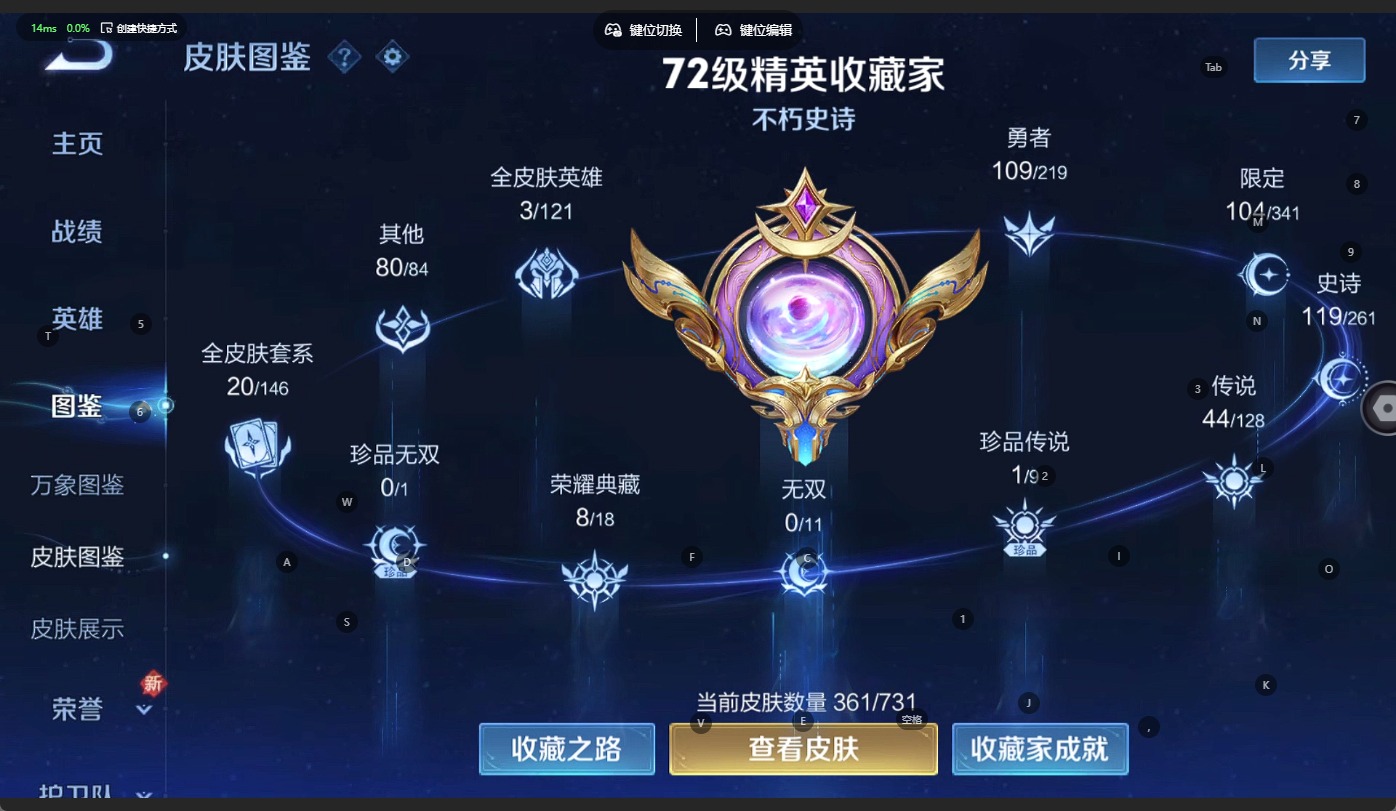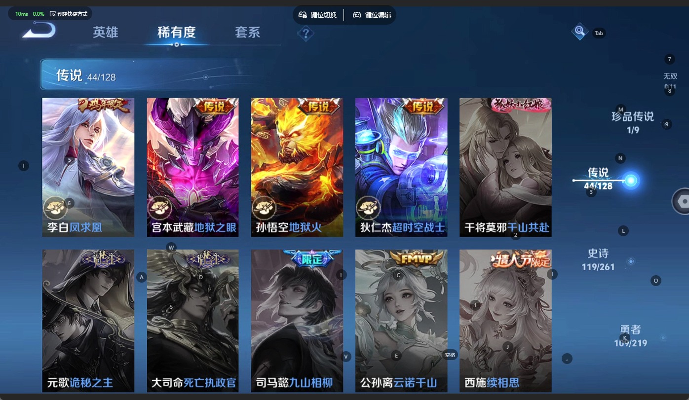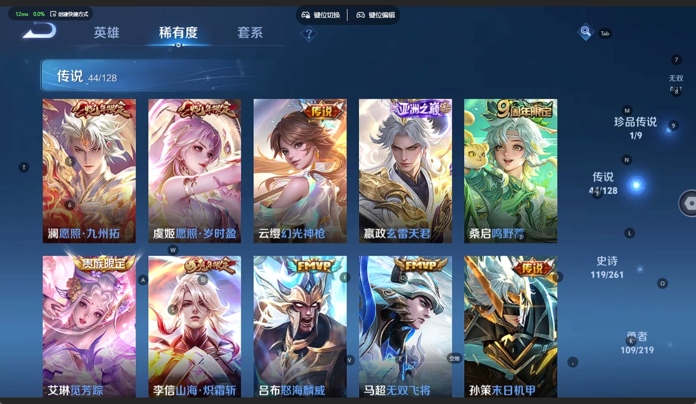 - [12296321]V5 1珍品传说 3传说 52英雄 40皮肤 可修改实名 嫦娥大国标 杨玉环小国标 夏洛特小国标 优质装备:器灵·落星盏,地狱之眼,浮生妄 传说皮:典韦战鼓燎原 史诗皮:鸭鸭历险记-刘禅,龙之律动,茶境仙,星夜王子,乘风破浪,鹰眼统帅,魅力维加斯