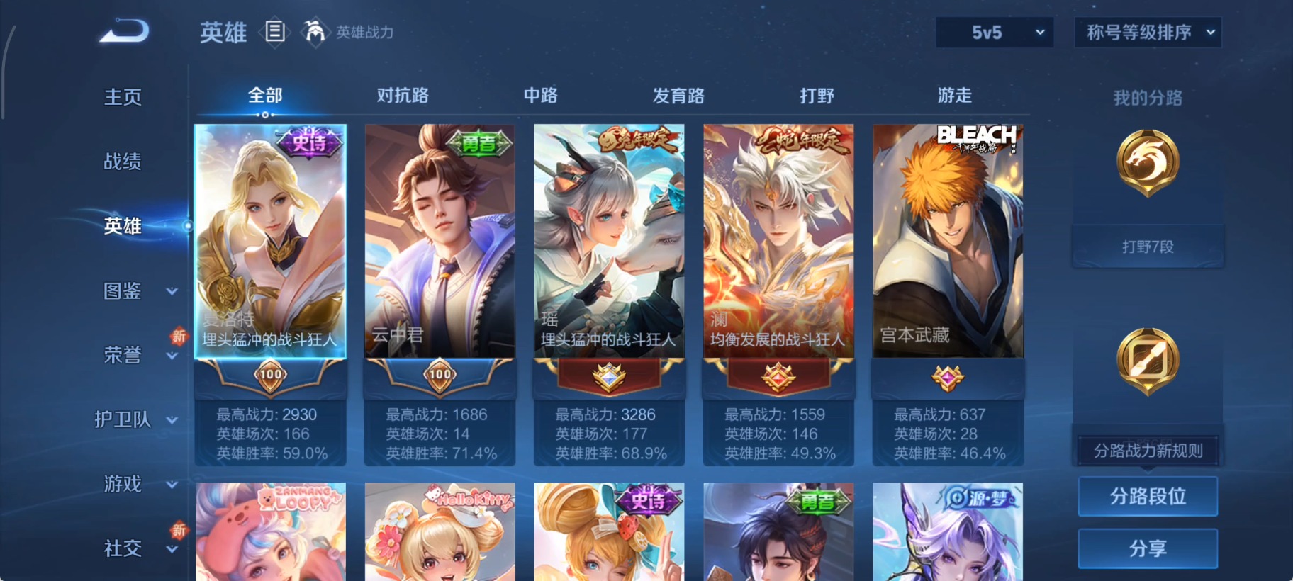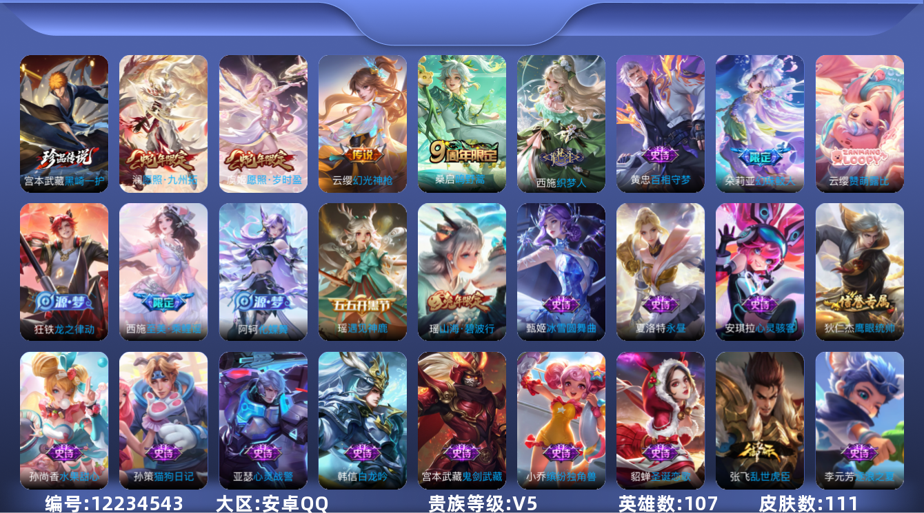 [12234543]V5 1珍品传说 4传说 107英雄 111皮肤 可修改实名 优质装备:黑崎一护 传说皮:幻光神枪 限定皮:愿照·九州拓(澜年限),愿照·岁时盈(虞姬年限),逐霄战戟,鸣野蒿,山海·碧波行(瑶年限),至美·乘鲤谣 史诗皮:赞萌露比,化蝶舞,龙之律动,百相守梦-黄忠,幻珠鲛人,织梦人,遇见神鹿,白龙吟,永昼,猫狗日记-孙策,乱世虎臣,水果甜心,天才门将,心灵骇客,鬼剑武藏,心灵战警,缤纷独角兽,逐浪之夏,圣诞恋歌,鹰眼统帅,魅力维加斯