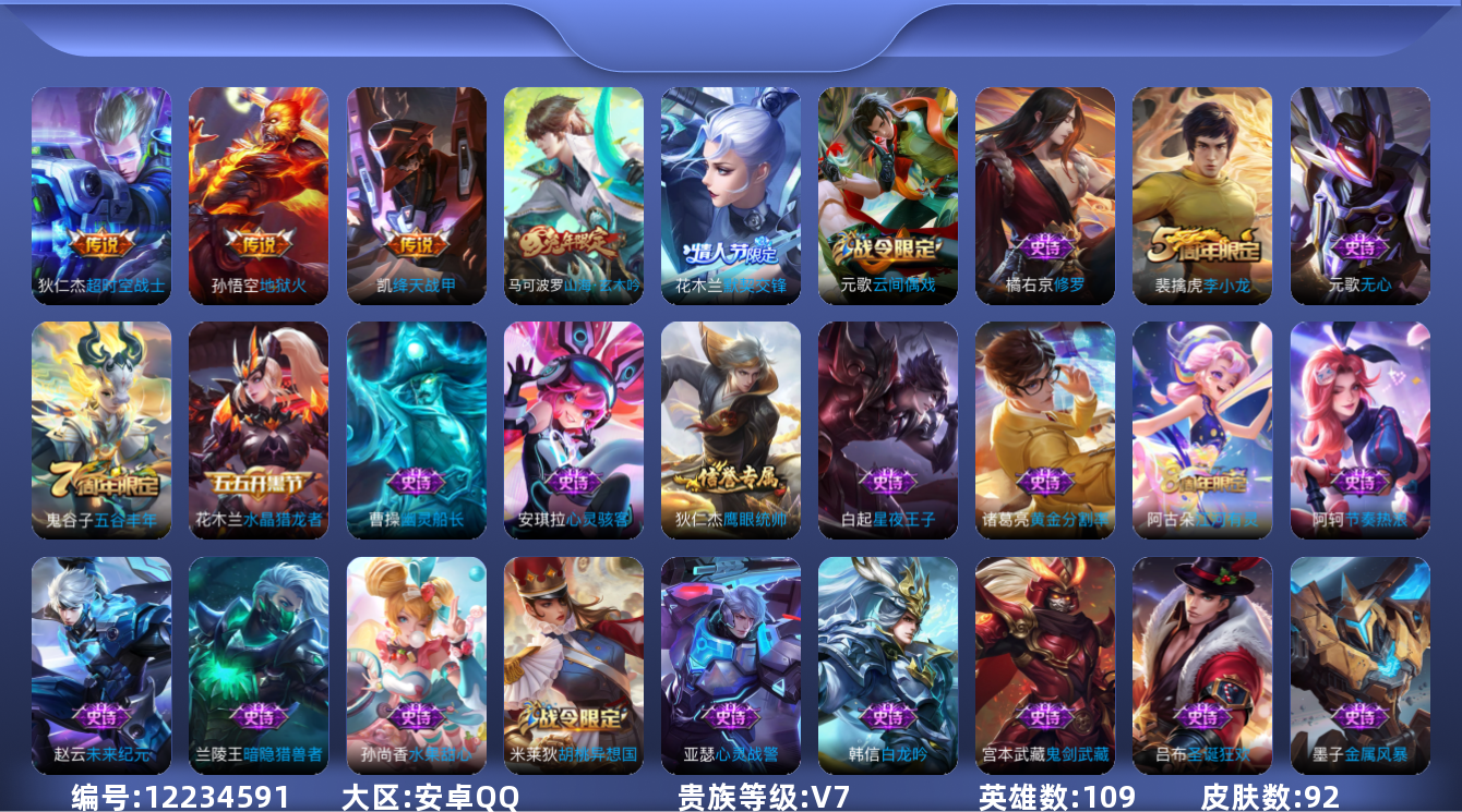 - [11913213]V7 6传说 123英雄 223皮肤 可修改实名 女号 优质装备:冠军飞将,绛天战甲(鸡嘴战神),猫影幻舞,地狱之眼,胖达荣荣,鹤羽星尊,涂山容容 珍宝阁皮:玩趣恶龙 限定皮:至尊宝,飞衡(韩信年限),高山流水,五谷丰年,青龙志(铠年限),梁祝,御风骁将(吕布年限),李小龙,霸王别姬-项羽,默契交锋-花木兰,大圣娶亲 史诗皮:幻珠鲛人,百相守梦-黄忠,织梦人,电玩小子(小书包),特工魅影,千年之狐,偶像歌手,电玩·爆裂旋风,猫狗日记-孙策,时之恋人-孙尚香,节奏热浪,修罗,女仆咖啡,摇滚巨星,水果甜心,天才门将,心灵骇客,鬼剑武藏,心灵战警,地狱岩魂,纤云弄巧,缤纷独角兽,金属风暴,圣诞狂欢,圣诞恋歌,鹰眼统帅,魅力维加斯,赏金猎手,无心