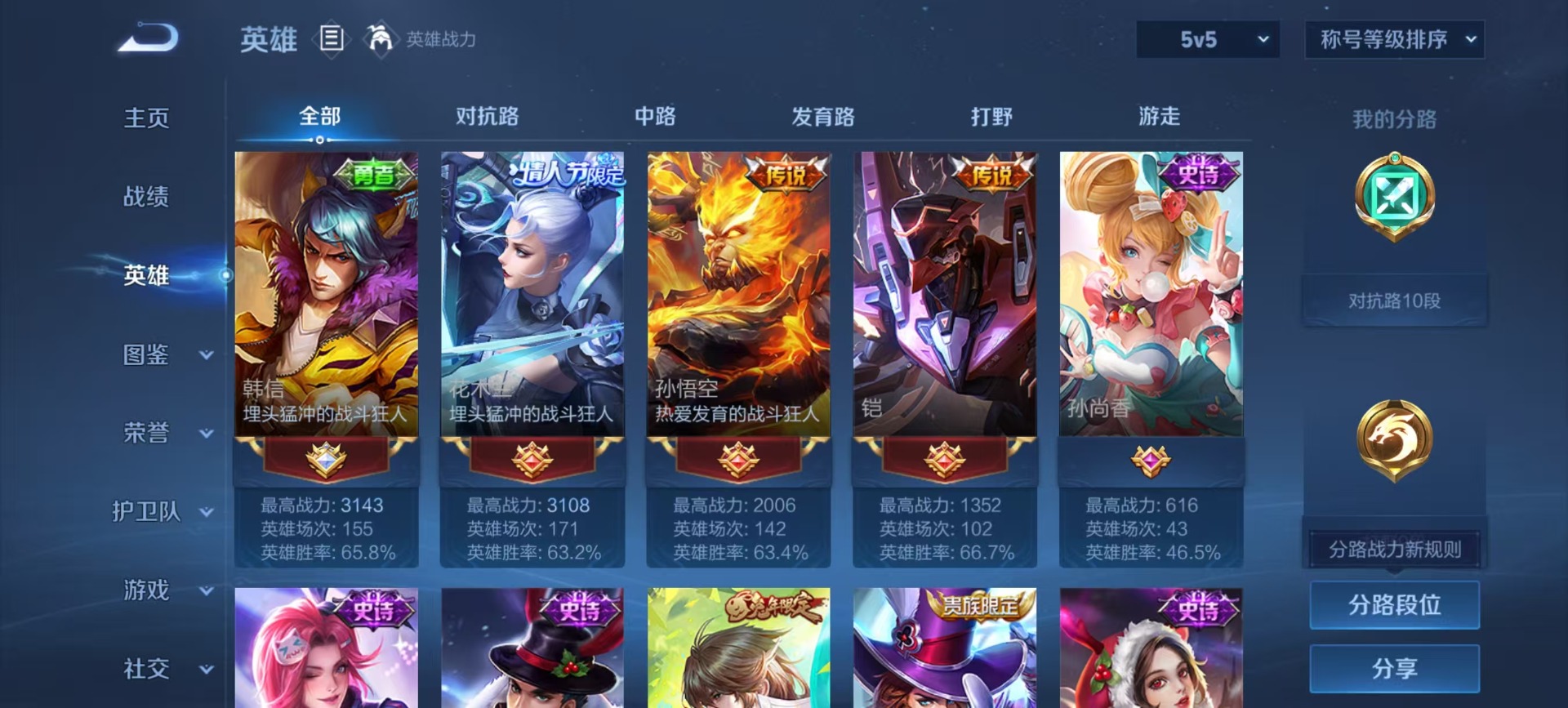 - PX_2085974-贵族等级: V5 英雄数: 117 皮肤数: 105 传说皮: 超时空战士-狄仁杰 限定皮: 武陵仙君,齐天大圣,鸣野蒿