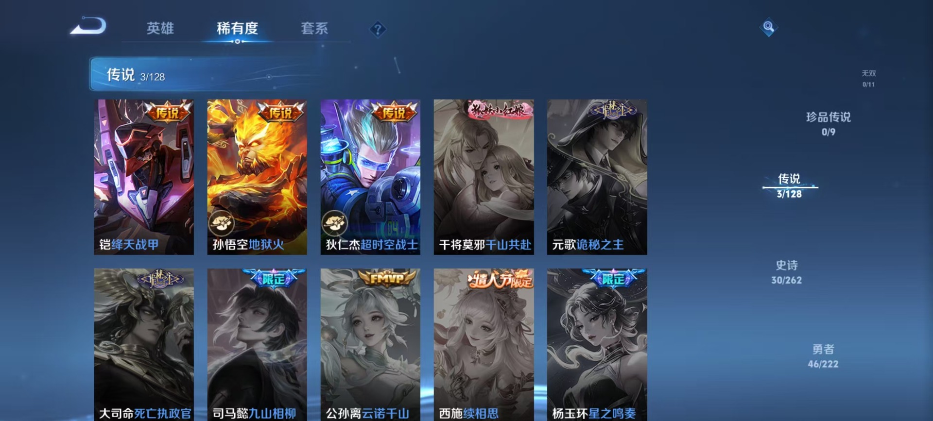 - PX_2081174-贵族等级: V4 英雄数: 121 皮肤数: 158 传说皮: 无双飞将,山海·炽霜斩,山海·苍雷引,幻光神枪 限定皮: 梁祝,引擎之心,飞衡,天狼狩猎者,孙行者,五谷丰年,诗剑行,山海·玄木吟,鸣野蒿,愿照·九州拓