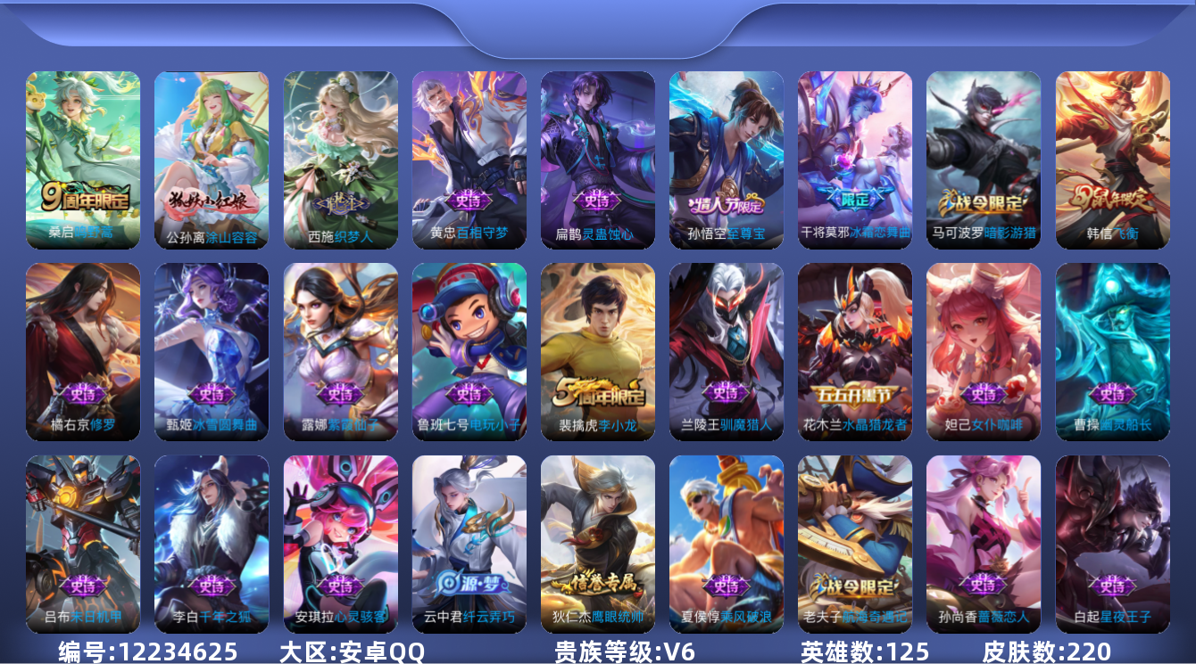 [12234625]V6 1传说 125英雄 220皮肤 可修改实名 女号 优质装备:涂山容容 珍宝阁皮:万物之道,优雅恋人,蔷薇恋人 限定皮:鸣野蒿,至尊宝,飞衡(韩信年限),遇见飞天,高山流水,梁祝,李小龙,冰霜恋舞曲 史诗皮:灵蛊蚀心,百相守梦-黄忠,织梦人,紫霞仙子,苍穹之光,电玩小子(小书包),黄金分割率,千年之狐,江河有灵,偶像歌手,末日机甲-吕布,猫狗日记-孙策,乱世虎臣,节奏热浪,修罗,女仆咖啡,摇滚巨星,水果甜心,绅士熊喵,星夜王子,心灵骇客,德古拉伯爵,幽灵船长,鬼剑武藏,心灵战警,地狱岩魂,纤云弄巧,繁星吟游(呼啦呼啦),缤纷独角兽,乘风破浪,逐浪之夏,水晶猎龙者,箭羽风息,金属风暴,原初追逐者,圣诞狂欢,圣诞恋歌,鹰眼统帅,暗夜贵公子,魅力维加斯,黎明之约,未来纪元-赵云