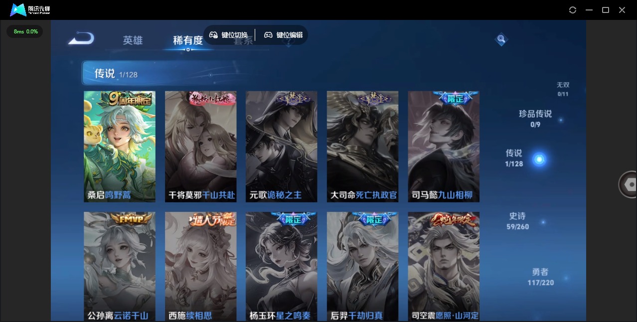 - [11517823]V8 1典藏 20传说 124英雄 283皮肤 可修改实名 女号 优质装备:鸣剑·曳影,黄金狮子座,久胜战神,炽阳神光,一念神魔,零号·赤焰,地狱之眼,时之恋人-刘备(电焊工),山海·苍雷引(电光曜子) 传说皮:貂蝉曦玄引,吕布曦玄引,典韦战鼓燎原,云诺千山,幻光神枪 珍宝阁皮:万物之道,优雅恋人,女武神 限定皮:愿照·九州拓(澜年限),愿照·千秋盛(女娲年限),鸣野蒿,至尊宝,白虎志(电光耗子),异界灵契(白毛香),神威(电光马子),飞衡(韩信年限),高山流水,五谷丰年,游园惊梦,梁祝,逐梦之星,李小龙,逐梦之影,朱雀志(守约年限),霸王别姬-项羽,孙行者,猪悟能,一生所爱,引擎之心,青春决赛季,冰霜恋舞曲,匿光追影者,寅虎·御盾(廉颇年限),寅虎·瑞焰(虎皮蛋子) 史诗皮:鸭鸭历险记-刘禅,器灵·浮梦炉,化蝶舞,星界战将,石田雨龙,茶境仙,埋骨钱,乘龙·聚宝船(安琪拉年限),百相守梦-黄忠,紫霞仙子,黄金分割率,特工魅影,千年之狐,江河有灵,高渐离燃音魔法,蒙恬荣光圣徽,偶像歌手,晚萤,青蛇,猫狗日记-孙策,猫狗日记-大乔,乱世虎臣,节奏热浪,修罗,女仆咖啡,摇滚巨星,水果甜心,绅士熊喵,天才门将,星夜王子,心灵骇客,时之奇旅-安琪拉,功夫厨神,德古拉伯爵,暗隐猎兽者,幽灵船长,鬼剑武藏,心灵战警,乐园奇幻夜,舞动绿茵,地狱岩魂,纤云弄巧,繁星吟游(呼啦呼啦),缤纷独角兽,乘风破浪,逐浪之夏,月团寄思,水晶猎龙者,曙光守护者,箭羽风息,金属风暴,原初追逐者,圣诞狂欢,圣诞恋歌,鹰眼统帅,魅力维加斯,黎明之约,寅虎·御盾,无心,未来纪元-赵云