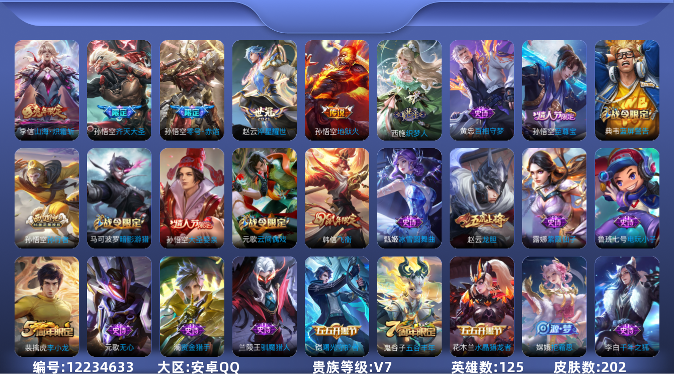 [12234633]V7 5传说 125英雄 202皮肤 可修改实名 优质装备:地狱火,零号·赤焰,淬星耀世,山海·炽霜斩(李信年限) 珍宝阁皮:优雅恋人 限定皮:至尊宝,飞衡(韩信年限),高山流水,齐天大圣,五谷丰年,龙胆,李小龙,孙行者,大圣娶亲,美猴王 史诗皮:百相守梦-黄忠,织梦人,紫霞仙子,电玩小子(小书包),黄金分割率,特工魅影,千年之狐,冰冠公主,蒙恬荣光圣徽,偶像歌手,龙骑士(小龙虾),节奏热浪,水果甜心,天才门将,鬼剑武藏,纤云弄巧,繁星吟游(呼啦呼啦),拒霜思,水晶猎龙者,曙光守护者,金属风暴,原初追逐者,圣诞狂欢,圣诞恋歌,鹰眼统帅,魅力维加斯,黎明之约,赏金猎手,无心