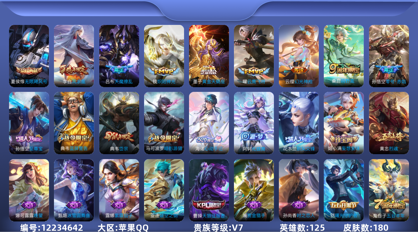 [12234642]V7 1典藏 8传说 123英雄 178皮肤 可修改实名 优质装备:无限飓风号(高达),云鹰飞将(小将军),炽阳神光,零号·赤焰,黄金天蝎座 传说皮:幻光神枪 珍宝阁皮:妄想食味,蔷薇恋人 限定皮:逐霄战戟,鸣野蒿,至尊宝,凤求凰(白切鸡),五谷丰年,烈魂,岱宗(典韦年限),天狼征服者,逐梦之影,默契交锋-花木兰,天魔缭乱 史诗皮:化蝶舞,破空之剑,海诺心动手记,决胜骁骑,蔬乡物语(鲁班七号),紫霞仙子,黄金分割率,特工魅影,高渐离燃音魔法,蒙恬荣光圣徽,冰冠公主,晚萤,电玩·爆裂旋风,末日机甲-吕布,猫狗日记-孙策,时之恋人-孙尚香,节奏热浪,摇滚巨星,水果甜心,绅士熊喵,星夜王子,心灵骇客,功夫厨神,德古拉伯爵,暗隐猎兽者,幽灵船长,鬼剑武藏,心灵战警,地狱岩魂,繁星吟游(呼啦呼啦),缤纷独角兽,乘风破浪,逐浪之夏,曙光守护者,热力回旋,金属风暴,原初追逐者,圣诞恋歌,鹰眼统帅,魅力维加斯,赏金猎手,未来纪元-赵云