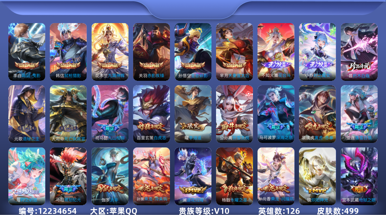 [12234654]V10 6典藏 2无双 1珍品传说 71传说 126英雄 499皮肤 典藏英雄武则天 可修改实名 优质装备:大秦宣太后,鸣剑·曳影,全息碎影(猴子典藏),九霄神辉(木兰典藏),赤影疾锋,弑枪猎影(韩信典藏),小乔时之魔女(小乔无双),花合斗,朽木白哉,黄金狮子座,黄金射手座,冠军飞将,云鹰飞将(小将军),绛天战甲(鸡嘴战神),黄金白羊座,猫影幻舞,久胜战神,炽阳神光,一念神魔,云霓雀翎,末日机甲-孙尚香(绿蚂蚱),地狱火,仲夏夜之梦(大飞蛾),音你心动-小乔,零号·赤焰,海洋之心,地狱之眼,飞鸢探春,音你心动-周瑜,胖达荣荣,李逍遥,乞巧织情,时之恋人-刘备(电焊工),游龙清影(小青龙),淬星耀世,超时空战士-狄仁杰,遇见胡旋,末日机甲-孙策,花朝如约(花篮子),挚爱之约,挚爱花嫁,无双飞将,音你闪耀(rap皮),碎云,天秀幻梦,神器·狴犴令,澜逐花归海,艾琳觅芳踪,琥珀纪元马超,诡秘之主,涂山容容 传说皮:乘龙·问璇玑(孙尚香年限),乘龙·铭钟鼎(赵云年限),乘龙·淬吴钩(孙策年限),貂蝉曦玄引,吕布曦玄引,落雪白狼,死亡执政官,九山相柳,幻光神枪 珍宝阁皮:万物之道,蔷薇恋人,玩趣恶龙 限定皮:逐霄战戟,鸣野蒿,白虎志(电光耗子),太华(伽罗年限),异界灵契(白毛香),傲雪梅枪,补天,寅虎·展翼(孙膑年限),前尘镜,星穹之声,绯月行,白鹤梁神女,白晶晶,时雨天司(水龙头),神威(电光马子),瑞麟志(木兰年限),遇见飞天,高山流水,诗剑行,匿光决锋者,降魔,五谷丰年,青龙志(铠年限),冰锋战神,武圣,天狼运算者,梁祝,御风骁将(吕布年限),天狼狩猎者,逐梦之星,烈魂,岱宗(典韦年限),天狼溯光者,虎魄,奔雷神使(牛魔年限),祈雪灵祝(雪兔子),天狼绘梦者,李小龙,逐梦之影,逐梦之光,玄武志(苏烈年限),朱雀志(守约年限),永曜之星,如梦令-嫦娥,如梦令-后羿,霸王别姬-项羽,霸王别姬-虞姬,奇迹圣诞,默契交锋-兰陵王,默契交锋-花木兰,孙行者,猪悟能,一生所爱,大圣娶亲,引擎之心,青春决赛季,云端筑梦师,乒乒小将,蜜橘之夏,热情桑巴,神奇女侠,匿光追影者,女儿国国王,寅虎·御盾(廉颇年限),寅虎·瑞焰(虎皮蛋子),寅虎·心曲(虎婆),寅虎·赤拳(老虎年限),时之祈愿-云中君,时之祈愿-瑶(瑶传限),玉兔公主,启示之音,无尽星芒,深海之息(深海大菠萝),唐三藏