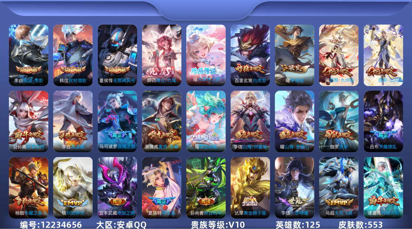 [12234656]V10 3典藏 1无双 1珍品传说 81传说 125英雄 553皮肤 可修改实名 优质装备:无限飓风号(高达),鸣剑·曳影,弑枪猎影(韩信典藏),青丘·九尾(妲己无双),大耳狗之梦,黄金狮子座,黄金射手座,冠军飞将,云鹰飞将(小将军),绛天战甲(鸡嘴战神),黄金白羊座,猫影幻舞,久胜战神,炽阳神光,一念神魔,云霓雀翎,末日机甲-孙尚香(绿蚂蚱),音你心动-小乔,零号·赤焰,地狱之眼,飞鸢探春,音你心动-周瑜,胖达荣荣,李逍遥,乞巧织情,时之恋人-刘备(电焊工),游龙清影(小青龙),淬星耀世,超时空战士-狄仁杰,遇见胡旋,花朝如约(花篮子),挚爱之约,挚爱花嫁,无双飞将,音你闪耀(rap皮),碎云,天秀幻梦,神器·狴犴令,山海·炽霜斩(李信年限),山海·琳琅生(小乔年限),山海·苍雷引(电光曜子),炽翼辉光(娃娃菜牛角包),燃星之曲,画中仙,浮生妄,记忆之芯(机甲兔),青丘·九尾,百相守梦(张飞),追逃游戏(亚瑟),追逃游戏(安琪拉),电玩·雷克斯,鹤羽星尊,灼幽烈阳,妄想实况,遇见神鼓,艾琳觅芳踪,涂山容容 传说皮:幻光神枪 珍宝阁皮:优雅恋人,女武神,玩趣恶龙 限定皮:愿照·九州拓(澜年限),愿照·山河定(司空震年限),鸣野蒿,至尊宝,白虎志(电光耗子),凤求凰(白切鸡),凤凰于飞,太华(伽罗年限),梅西,武陵仙君(小桃花),异界灵契(白毛香),傲雪梅枪,补天,寅虎·展翼(孙膑年限),前尘镜,星穹之声,绯月行,时之彼端,白鹤梁神女,白晶晶,时雨天司(水龙头),神威(电光马子),飞衡(韩信年限),玄嵩(庄周年限),山海·碧波行(瑶年限),无限倾心-项羽,瑞麟志(木兰年限),遇见飞天,高山流水,诗剑行,无限倾心-虞姬,齐天大圣,匿光决锋者,怒海麟威,降魔,五谷丰年,青龙志(铠年限),冰锋战神,幽恒(沐浴露),武圣,天狼运算者,游园惊梦,梁祝,御风骁将(吕布年限),天狼狩猎者,龙胆,逐梦之翼,逐梦之星,烈魂,岱宗(典韦年限),天狼溯光者,虎魄,逐梦之音,天狼征服者,奔雷神使(牛魔年限),祈雪灵祝(雪兔子),天狼绘梦者,李小龙,逐梦之影,逐梦之光,玄武志(苏烈年限),朱雀志(守约年限),永曜之星,辉光之辰,如梦令-嫦娥,如梦令-后羿,霸王别姬-项羽,霸王别姬-虞姬,圣诞老人,奇迹圣诞,默契交锋-兰陵王,默契交锋-花木兰,真爱至上,纯白花嫁,孙行者,猪悟能,一生所爱,